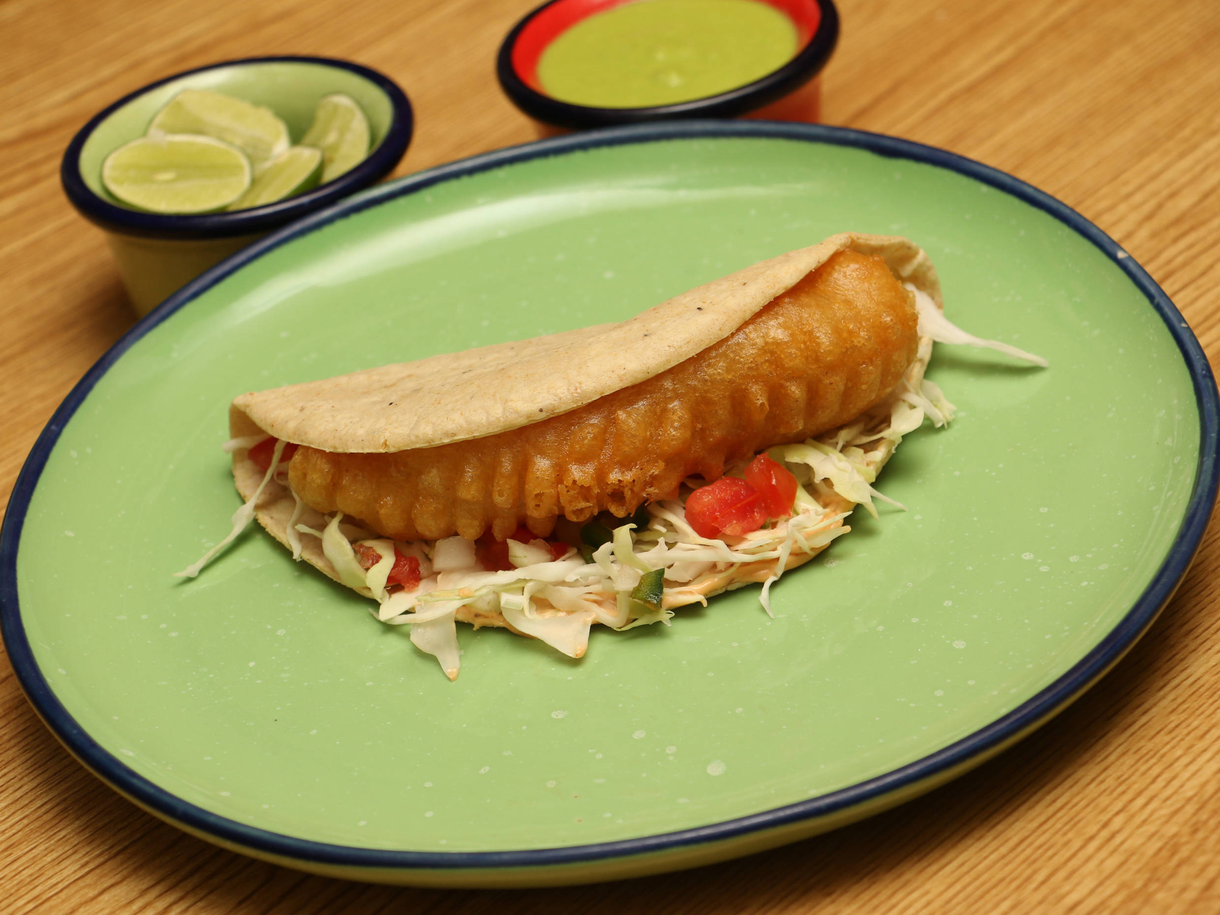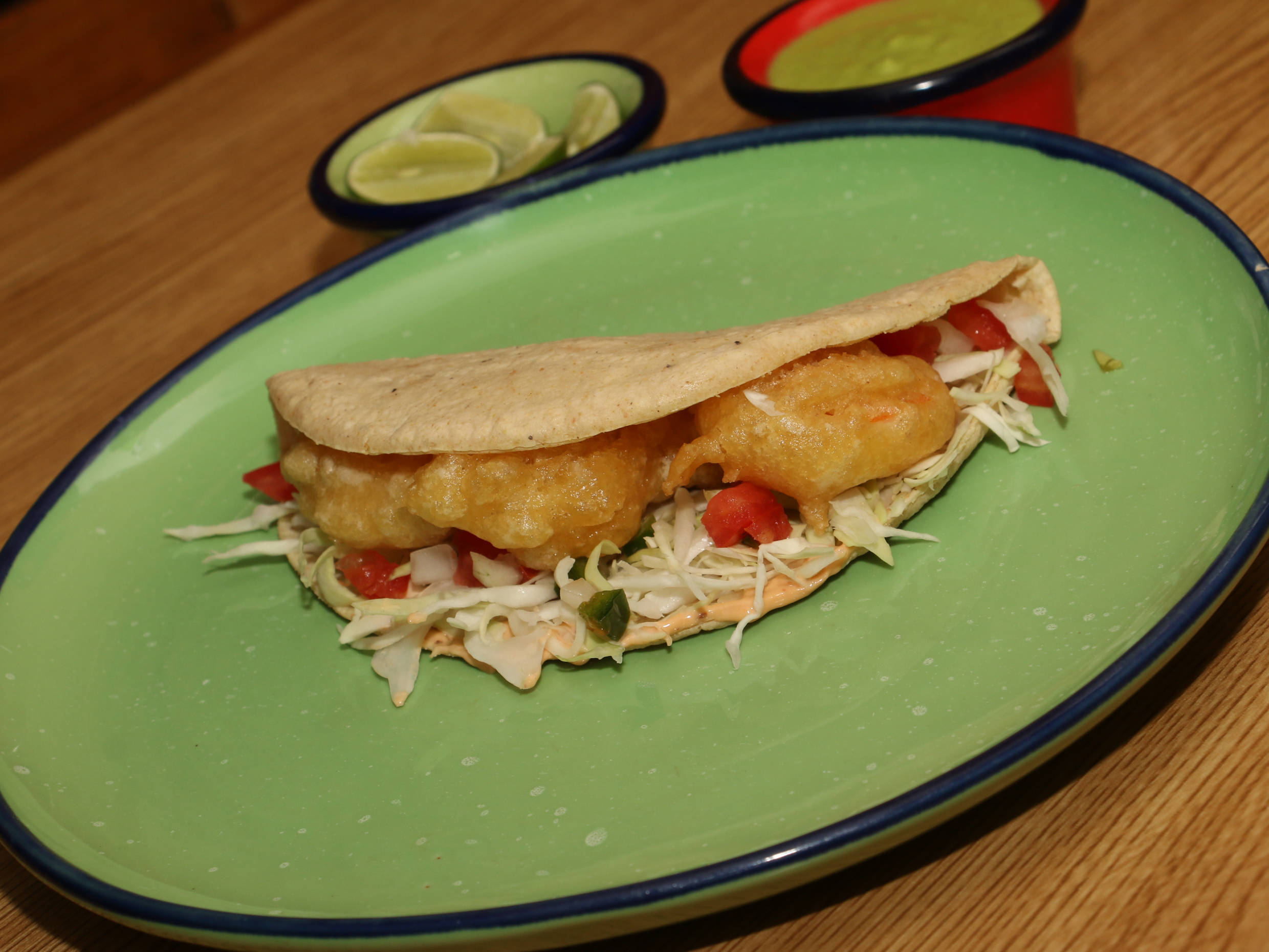 Camarones rebosados sobre una cama de col pico de gallo en tortilla de maíz con aderezo de mayonesa con chipotle.