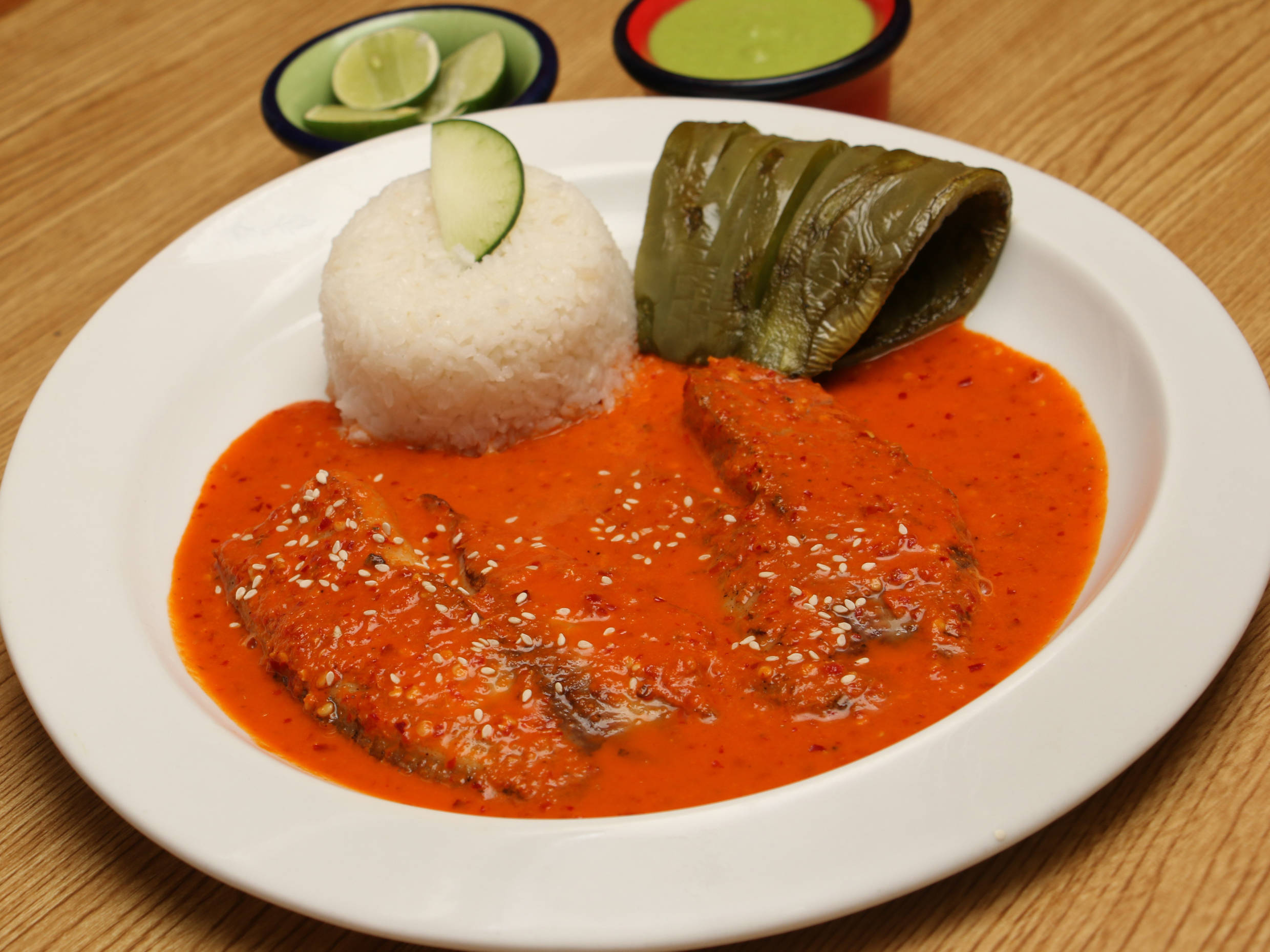 Delicioso filete de pescado en salsa pasilla, acompañado de arroz blanco y nopales a la plancha.