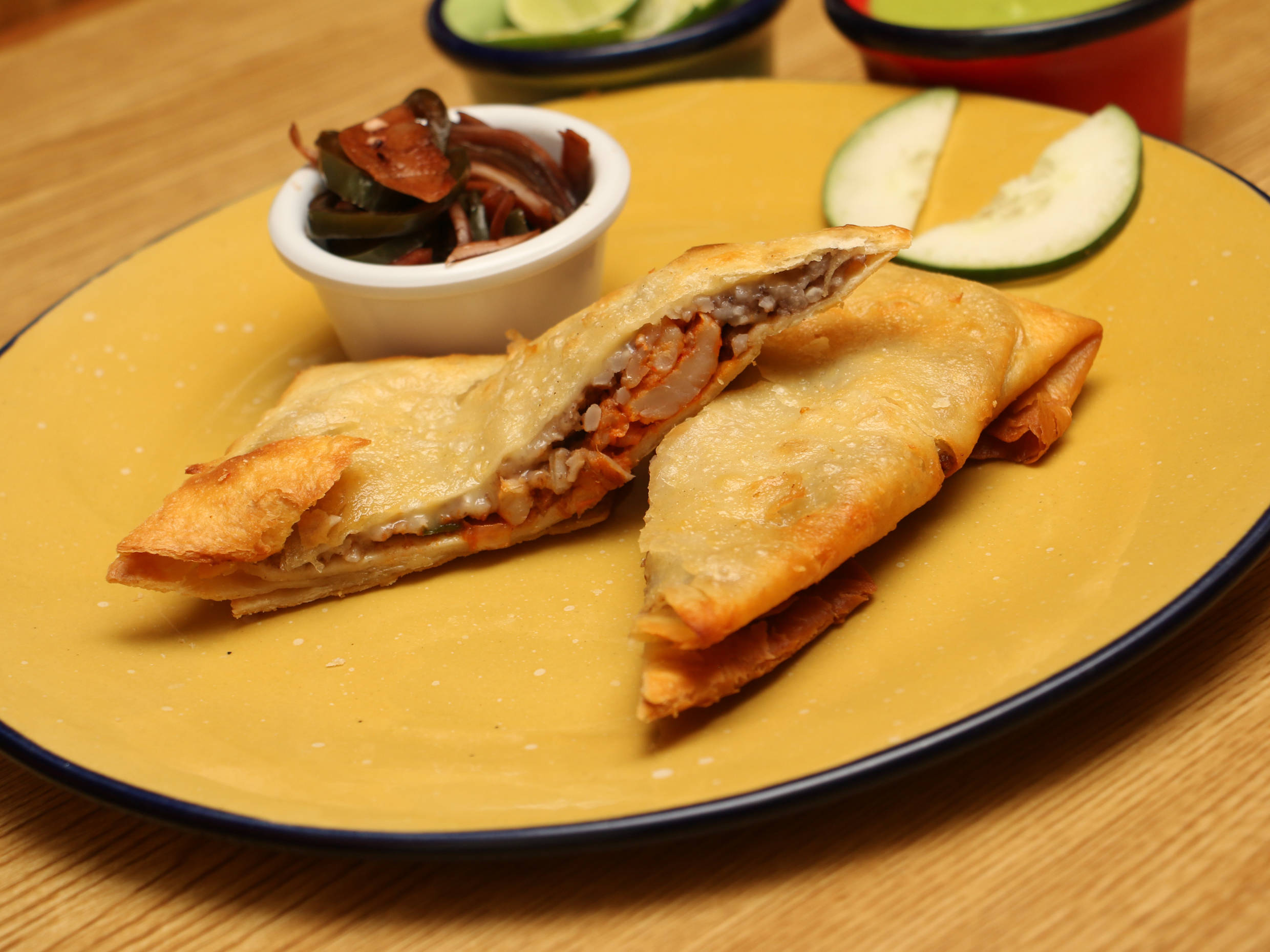 Deliciosa quesadilla frita rellena de camarón y pescado a la mexicana.