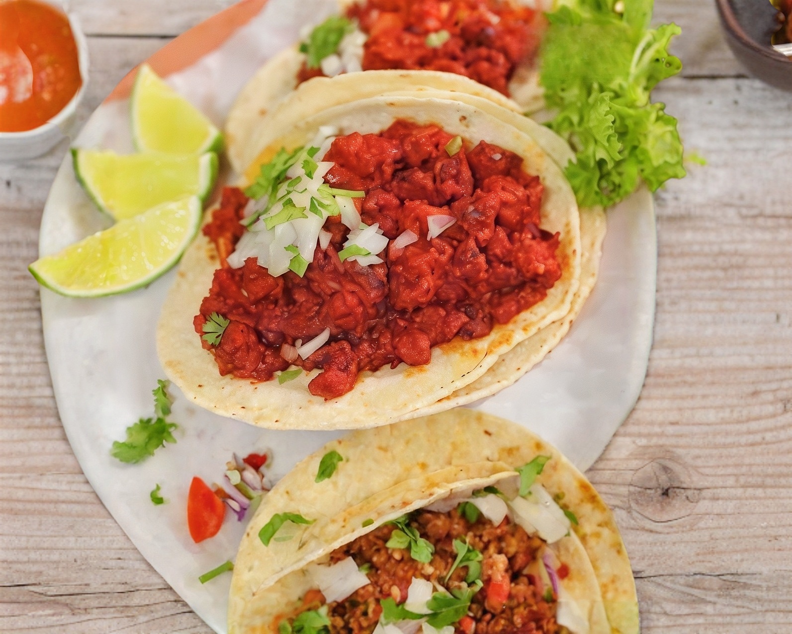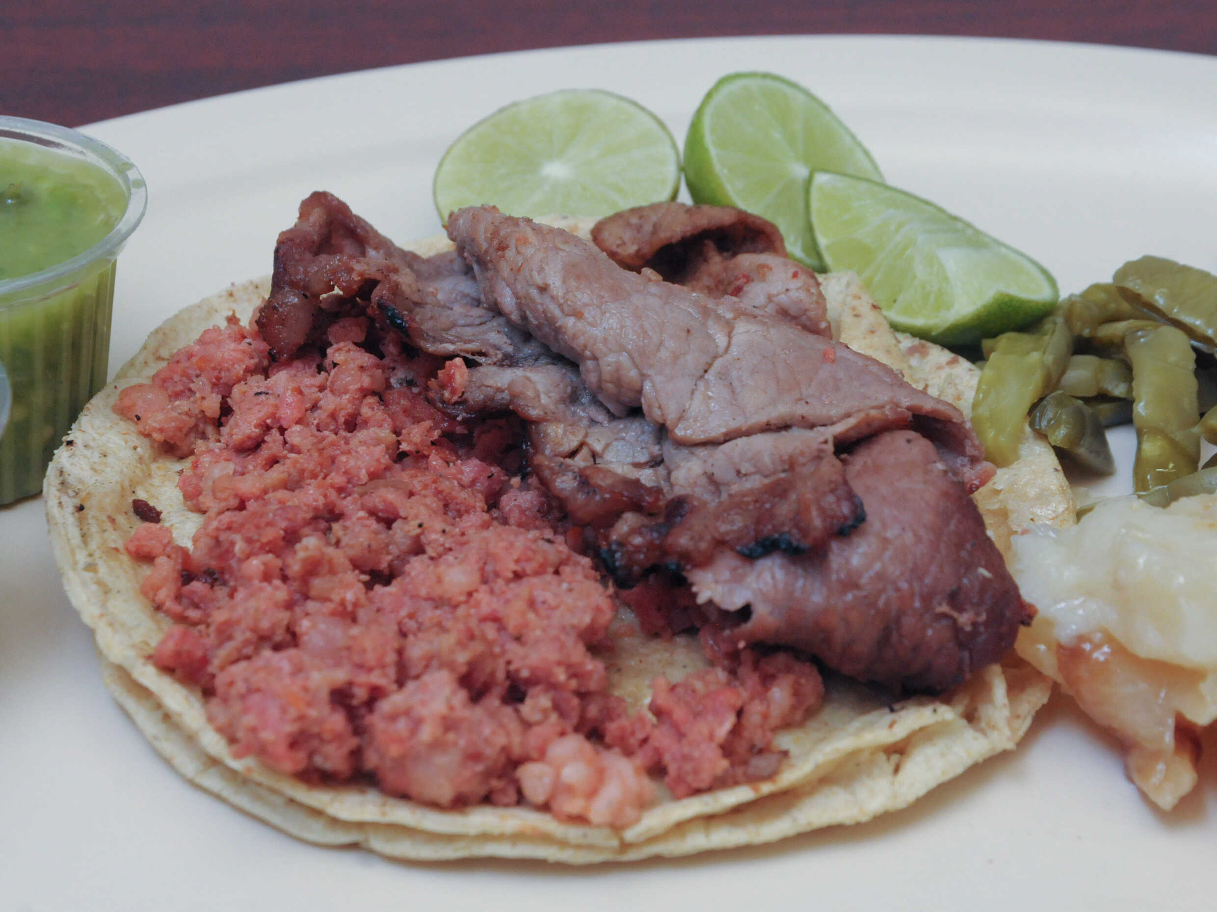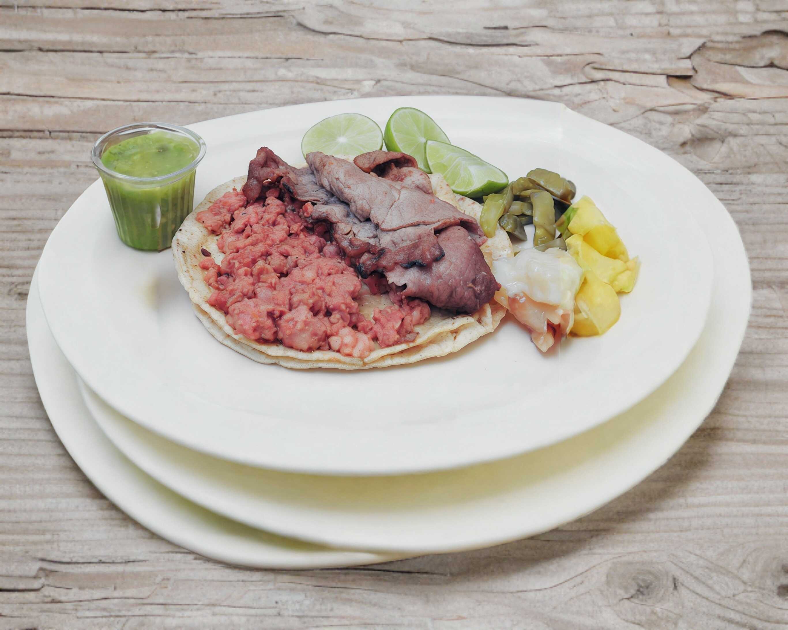 Gozarás de un taco relleno con 70-80 g de carne picada ,no en trozos , servido con una fusión de (papas ,nopales. ) Incluye salsa roja y limones, con guacamole disponible por separado para que lo añadas según tu preferencia.