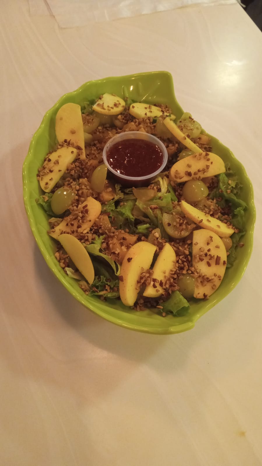 Lechuga fresca, espinaca, manzana fileteada, durazno, uvas y nueces, con aderezo tamarindo y chamoy