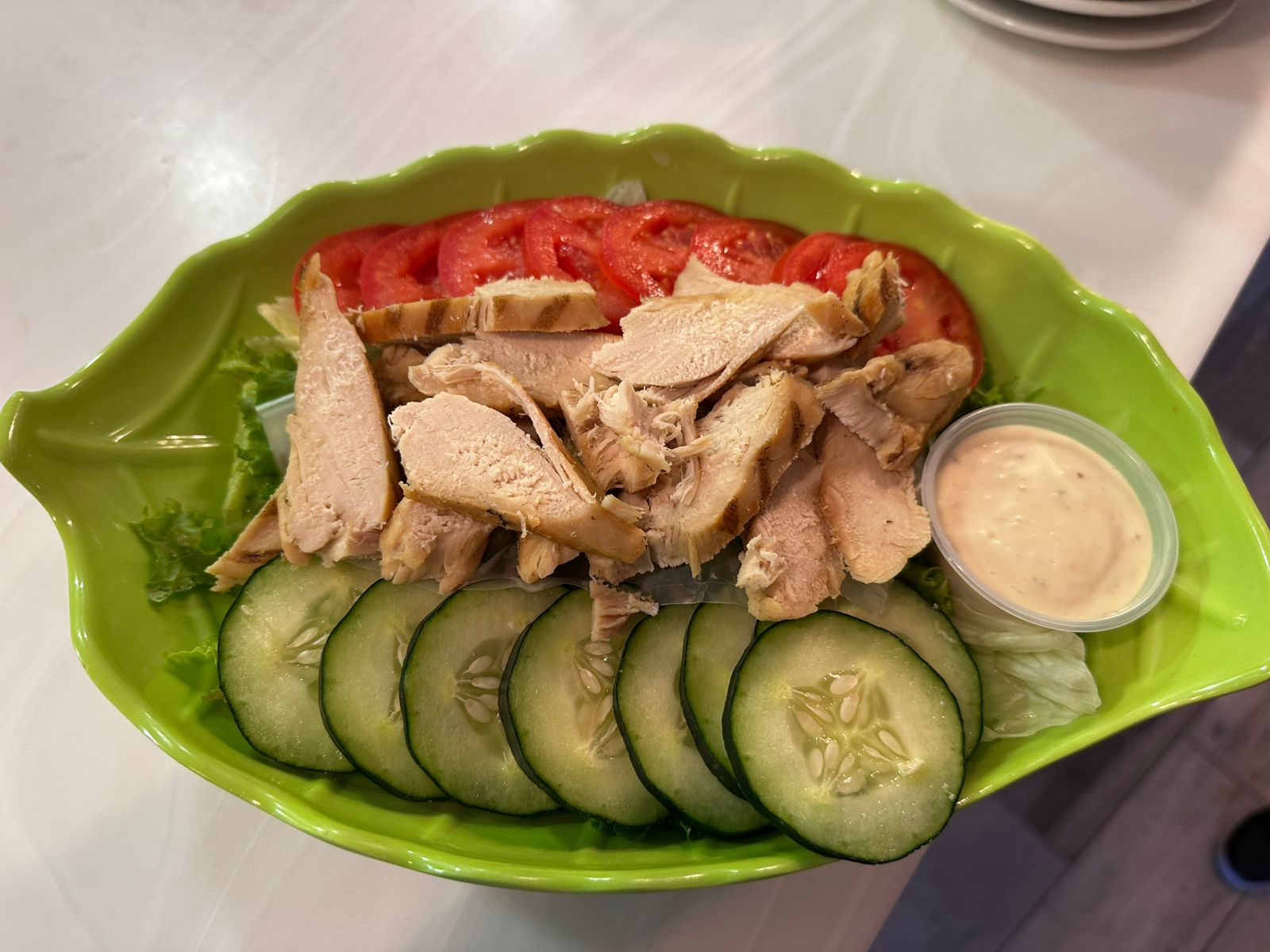 Lechuga fresca, espinaca, pepino y jitomate con ricas tiras de pechuga marinada
