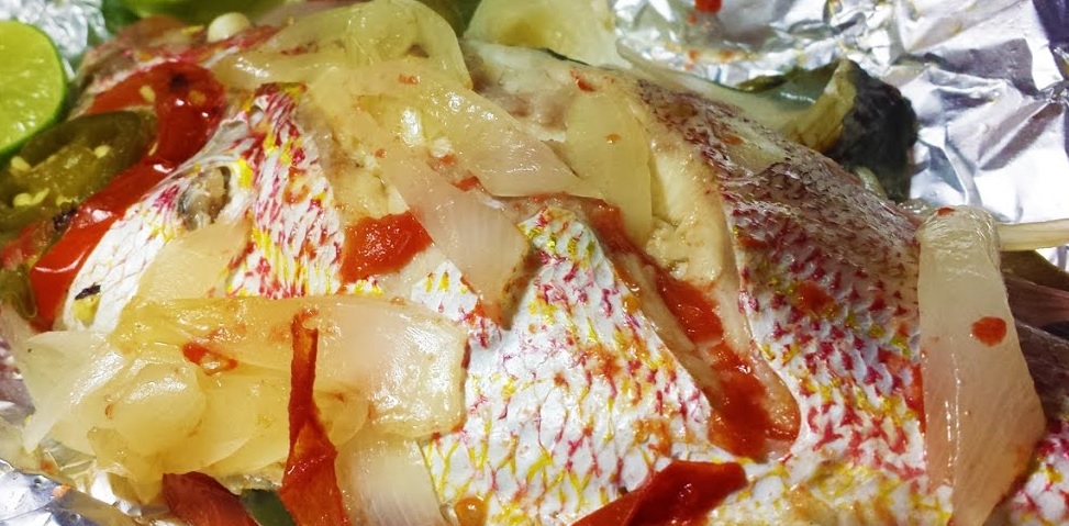 Huachinango de 700 grs empapelado con su chile cuaresmeño, cebolla y jitomate
