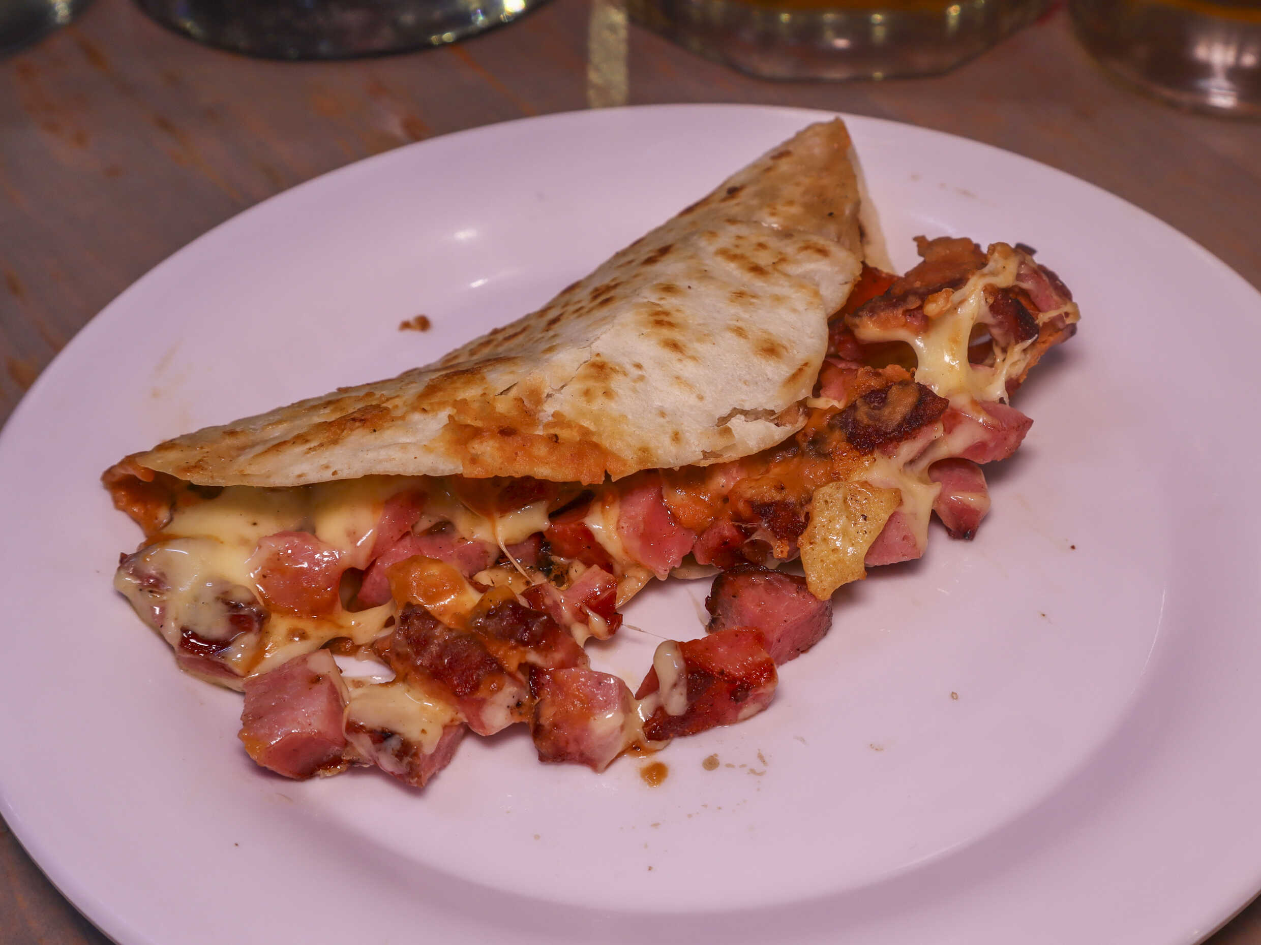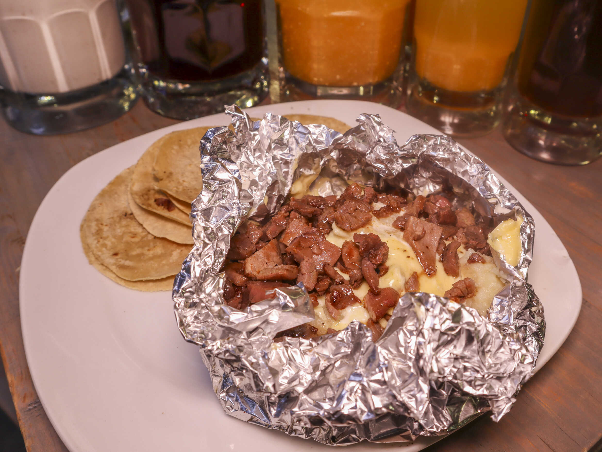 Tortilla de harina, pastor, tocino, queso manchego, frijoles maneados, crema y guacamole