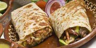 Tortilla de harina, frijoles maneados, pastor o bistec y queso manchego.