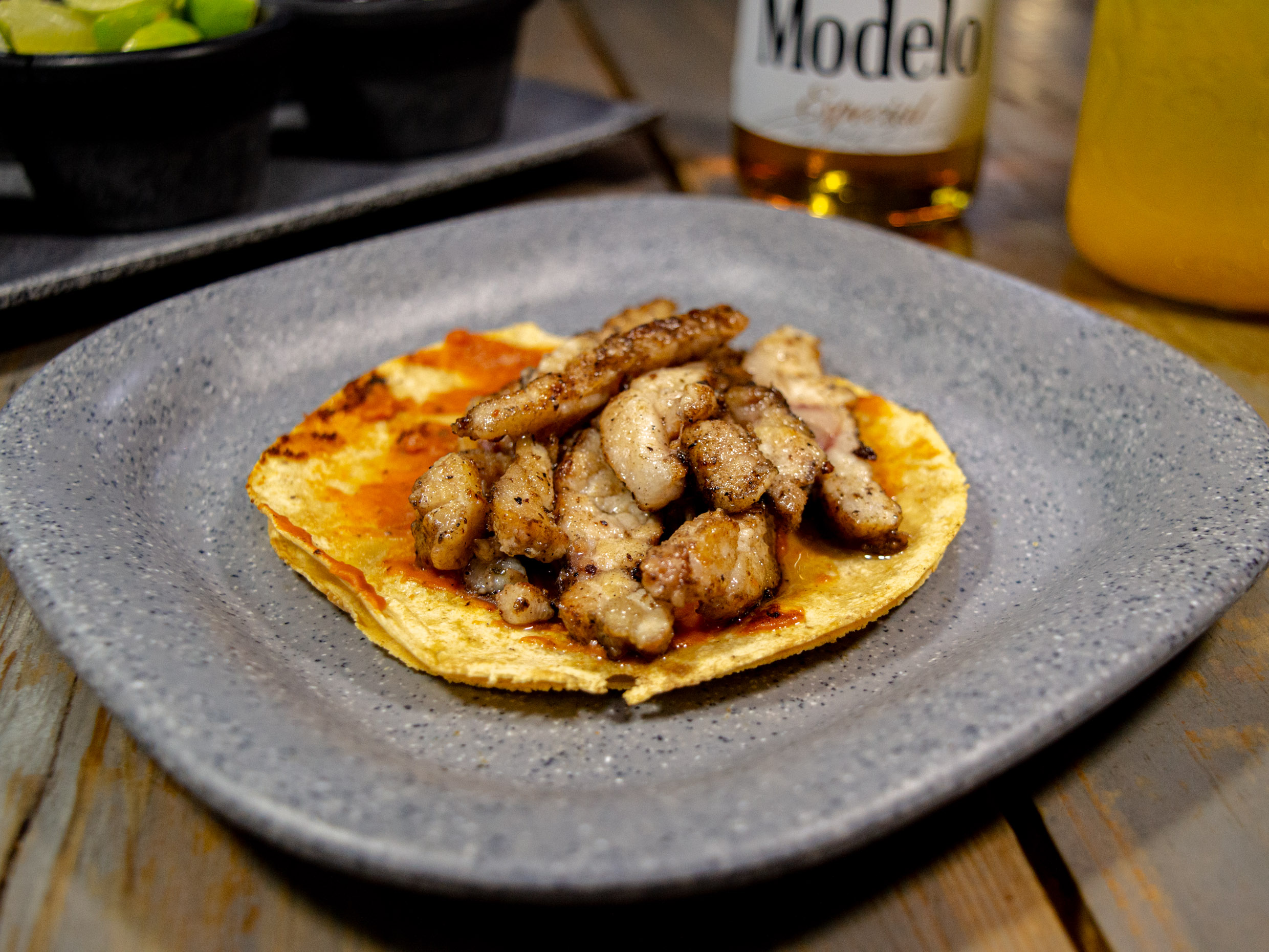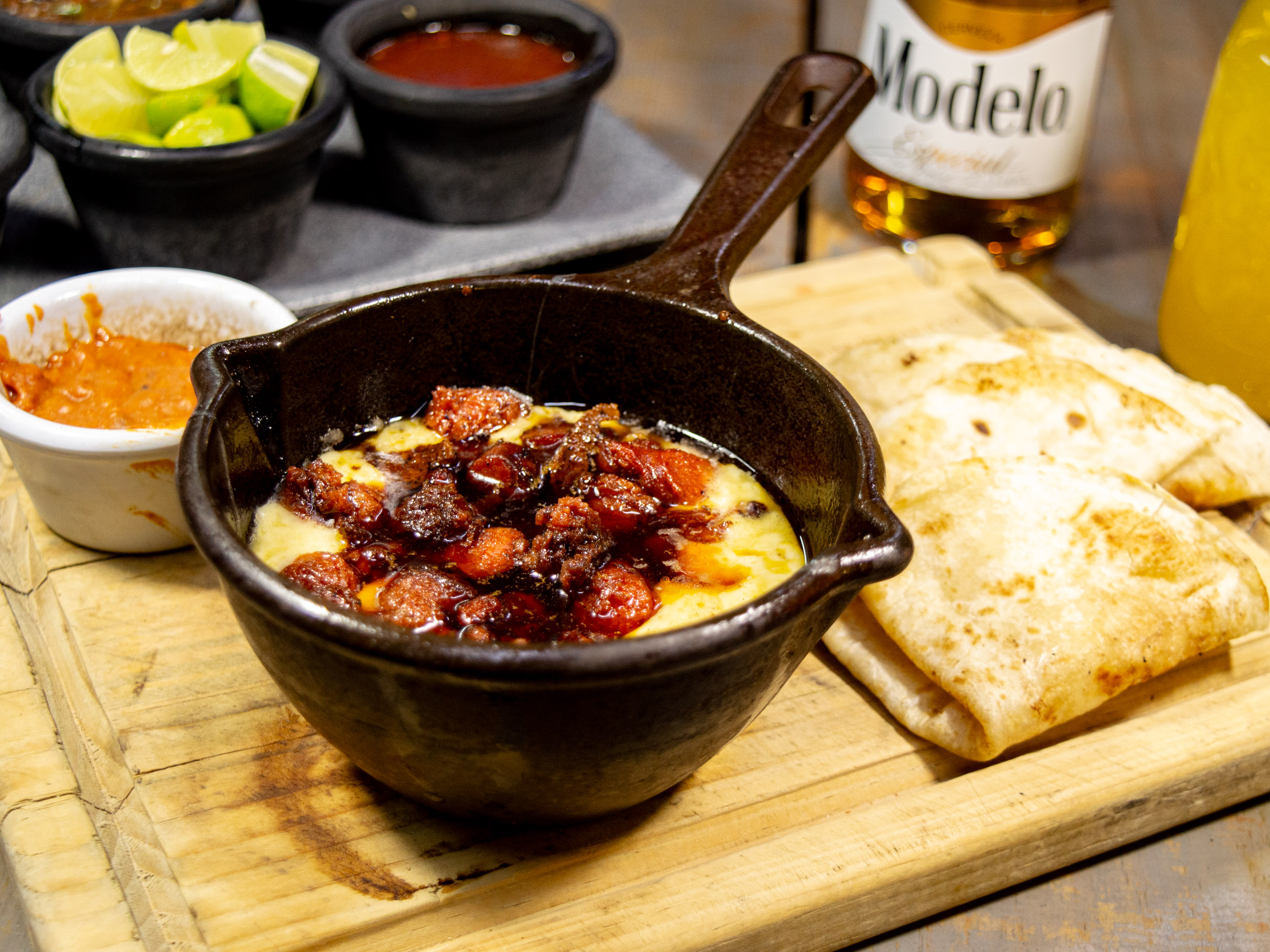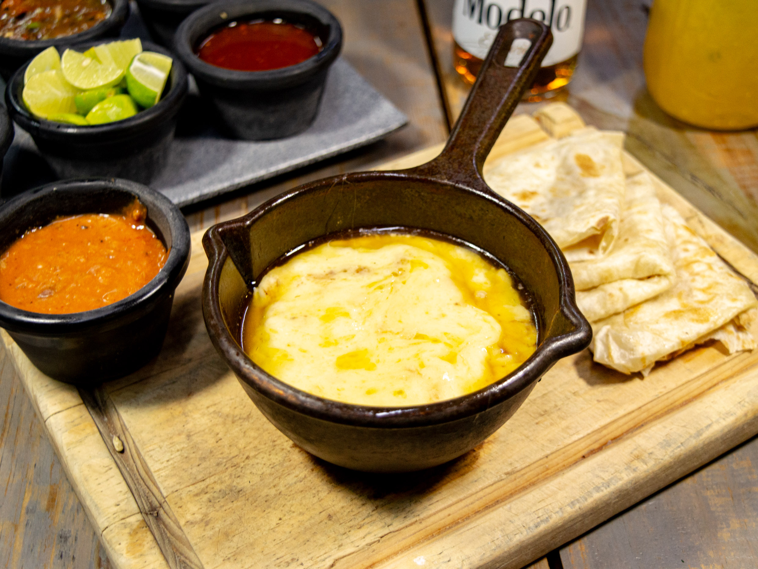 Tortilla de harina, frijoles maneados, top sirloin, chicharrón y salsa de la casa , queso manchego, crema y guacamole