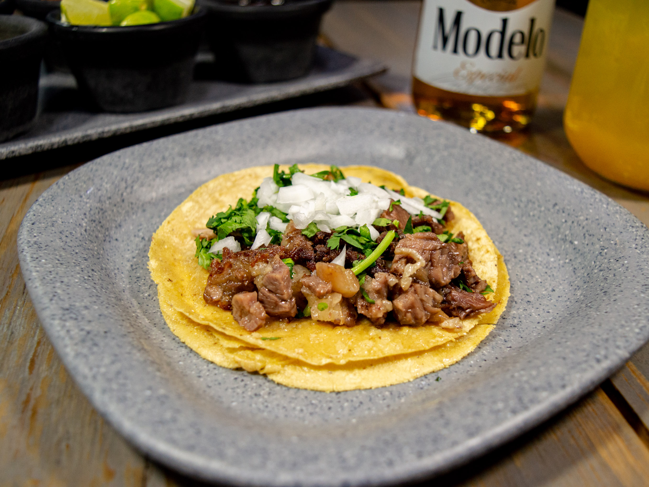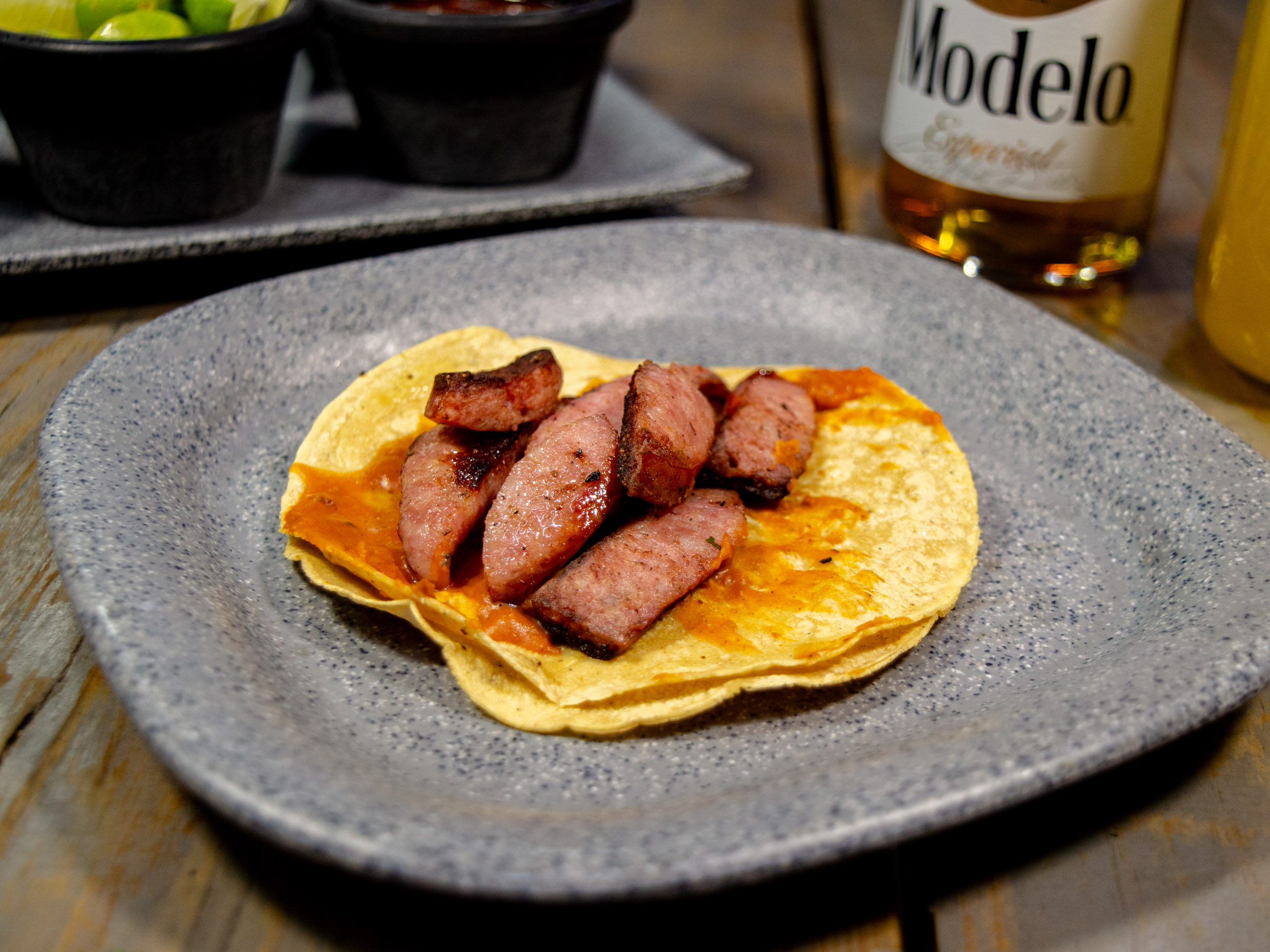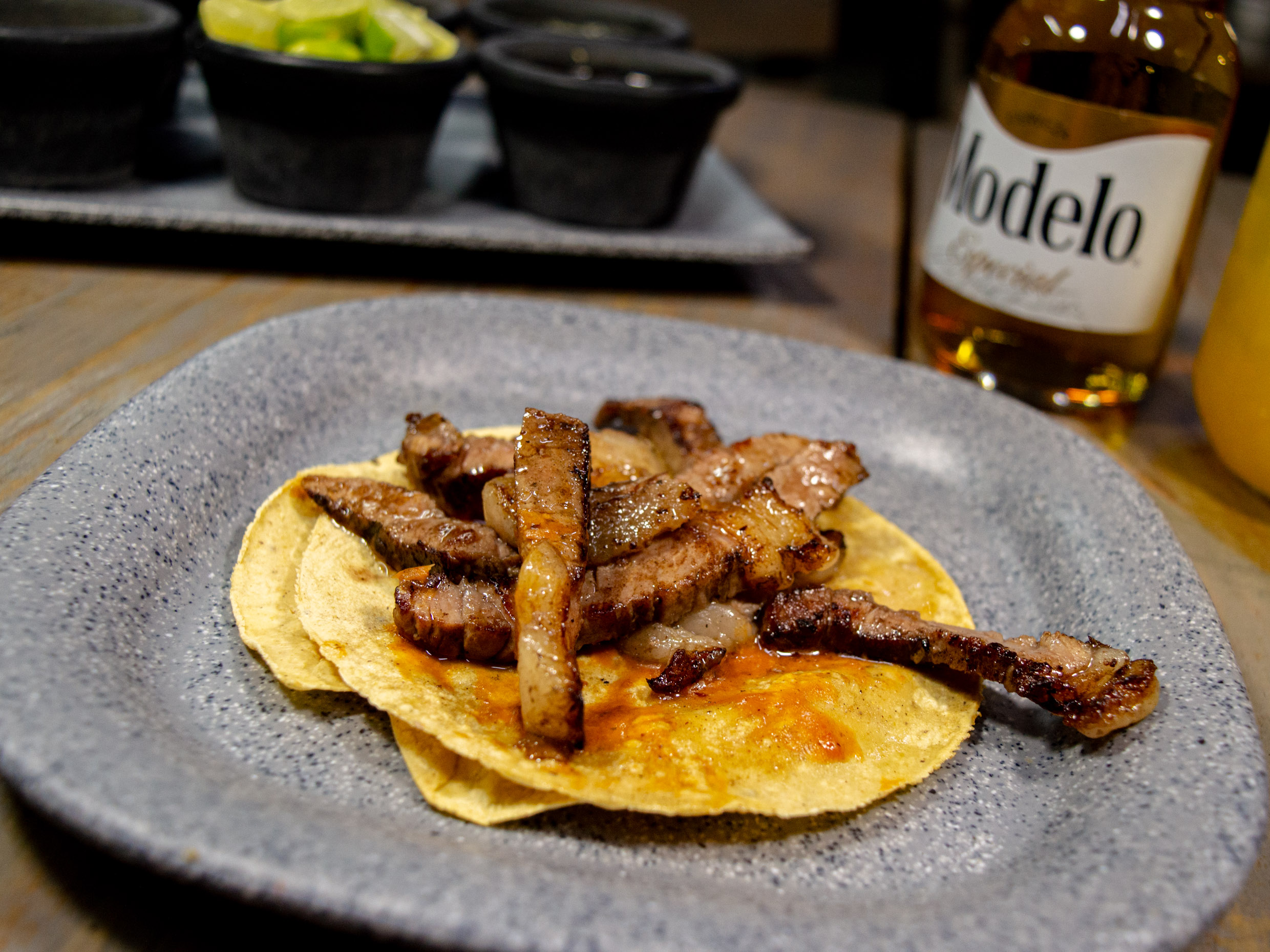3 tacos de sirloin y chicharrón acompañados de salsa de la casa y una orden frijoles charros