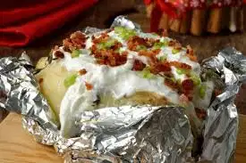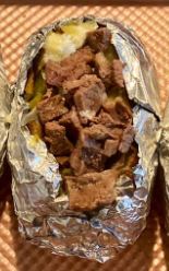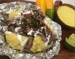Papa cocida con mantequilla, tocino, arrachera, queso manchego y crema, acompañada con frijoles y tortillas