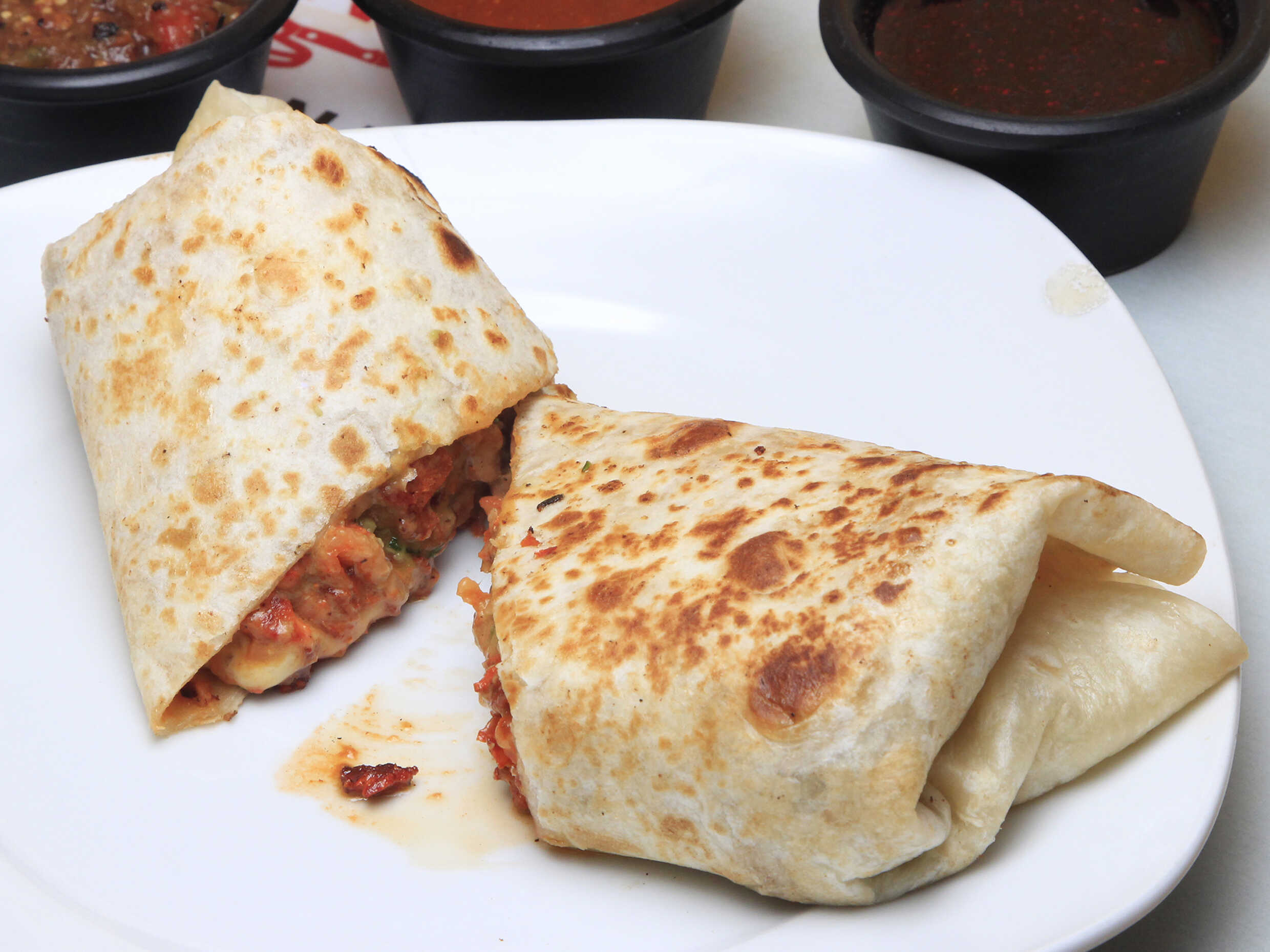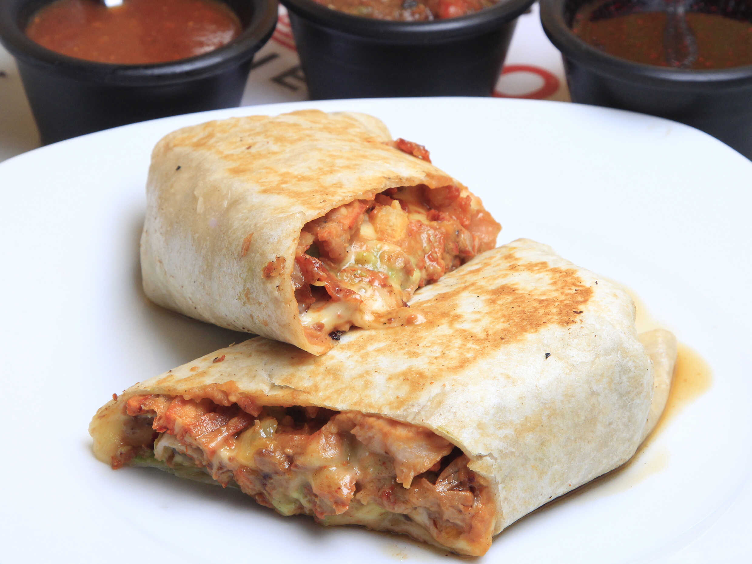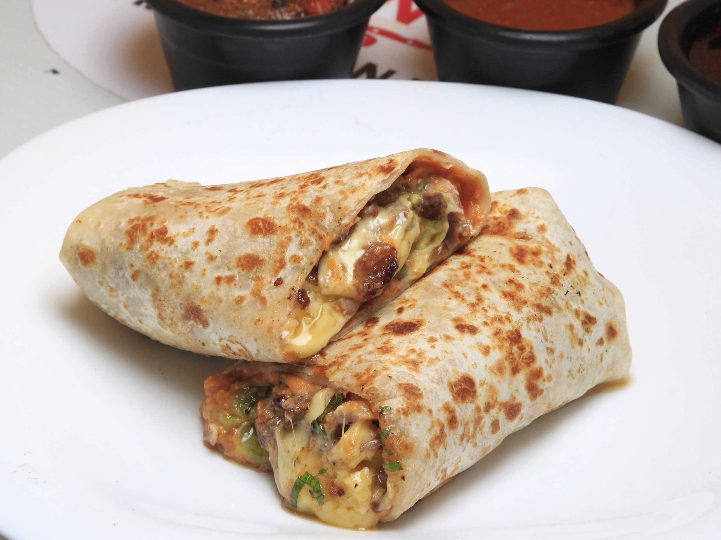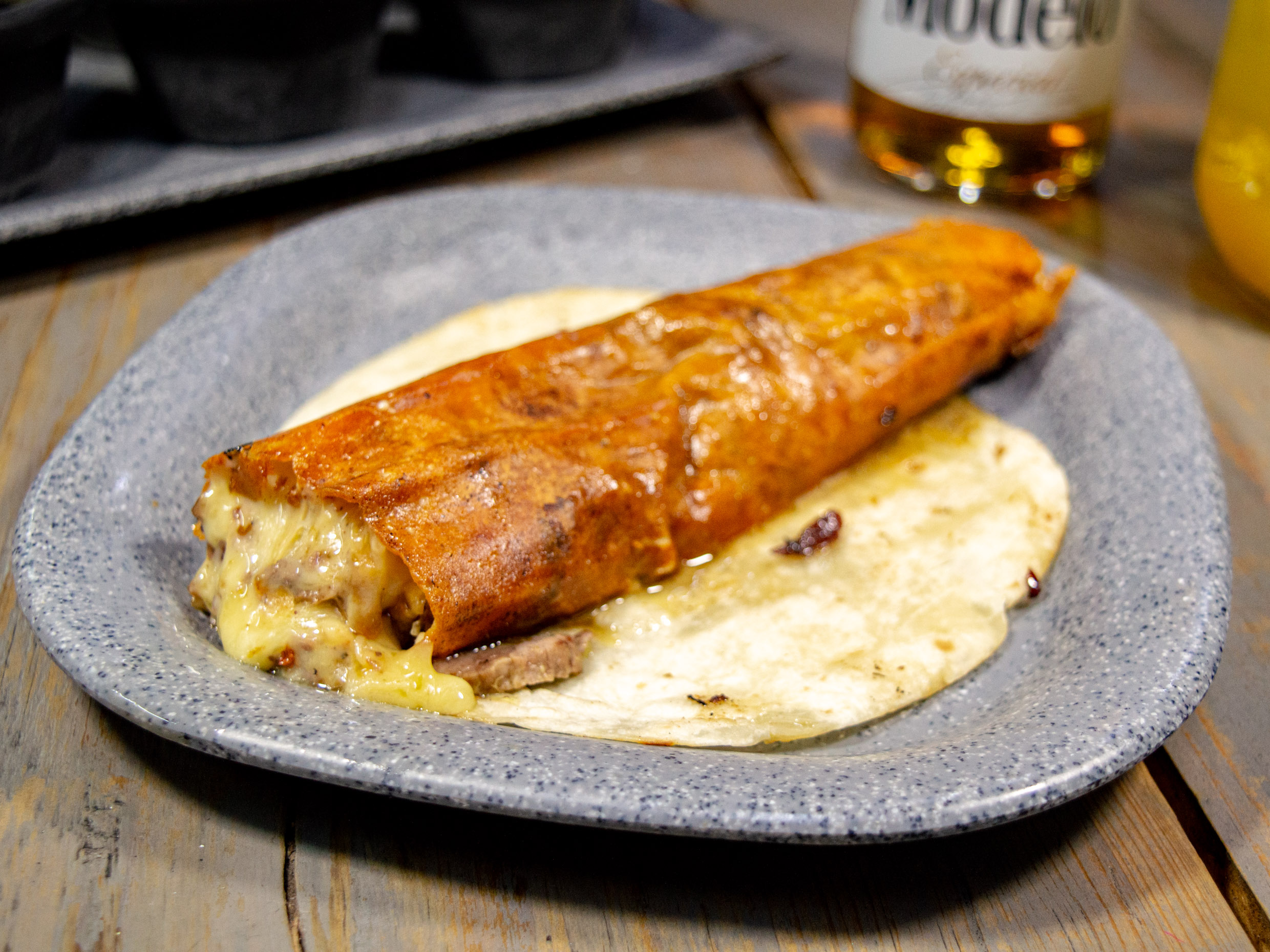 Tortilla de harina, frijoles maneados, carne de corte y queso manchego.