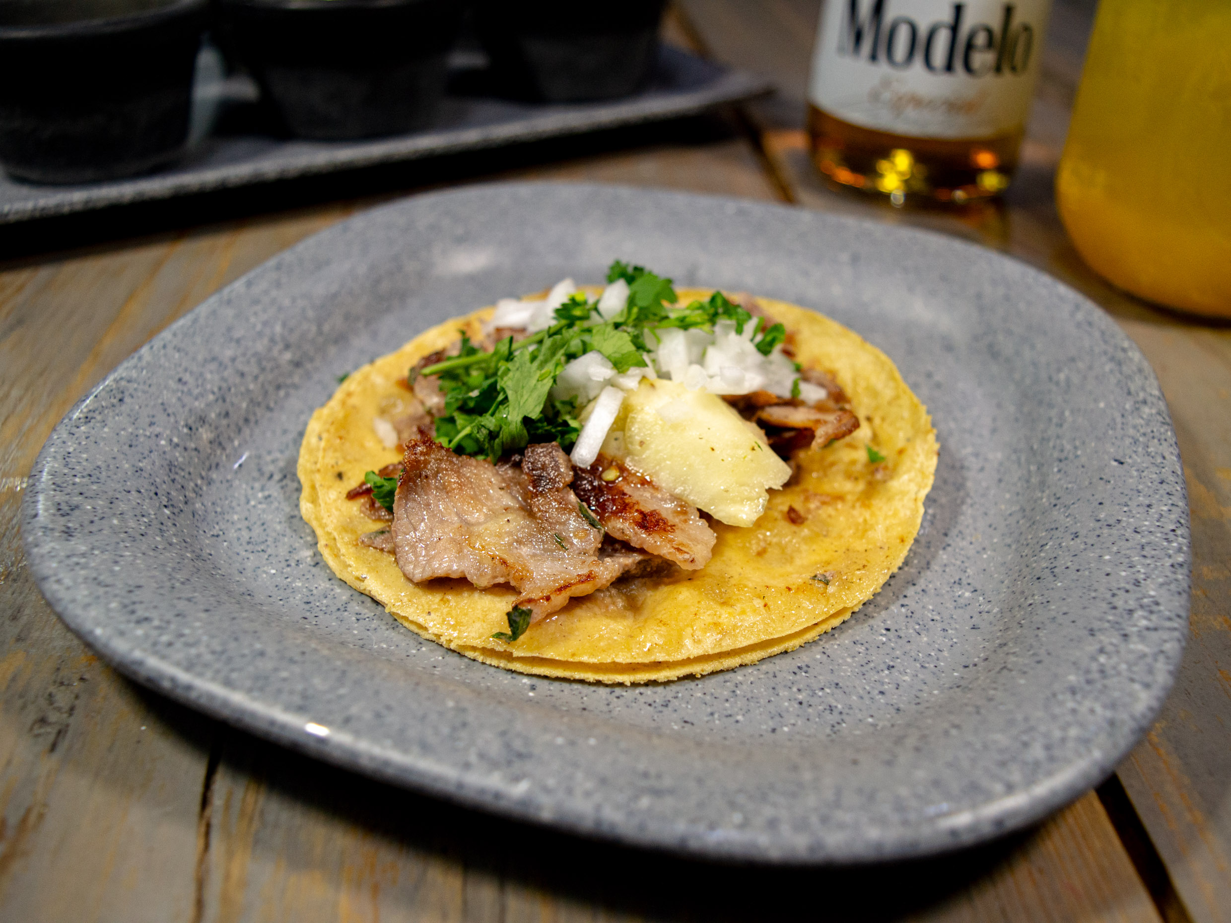 Pastor, tocino, pimiento, cebolla, queso manchego y tortillas