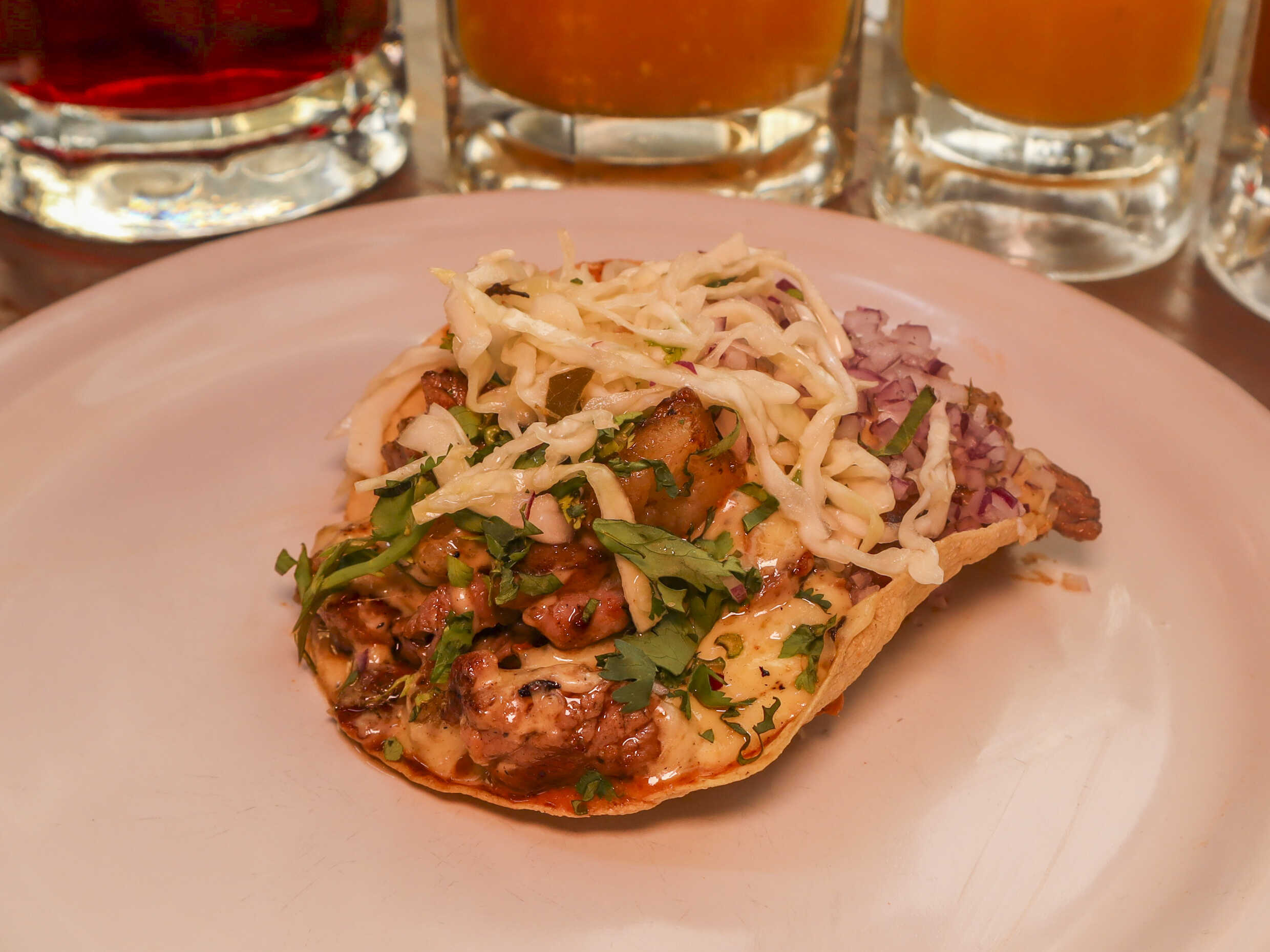 Tostada de maíz con frijoles maneados, queso, repollo, cebolla y bistec o pastor
