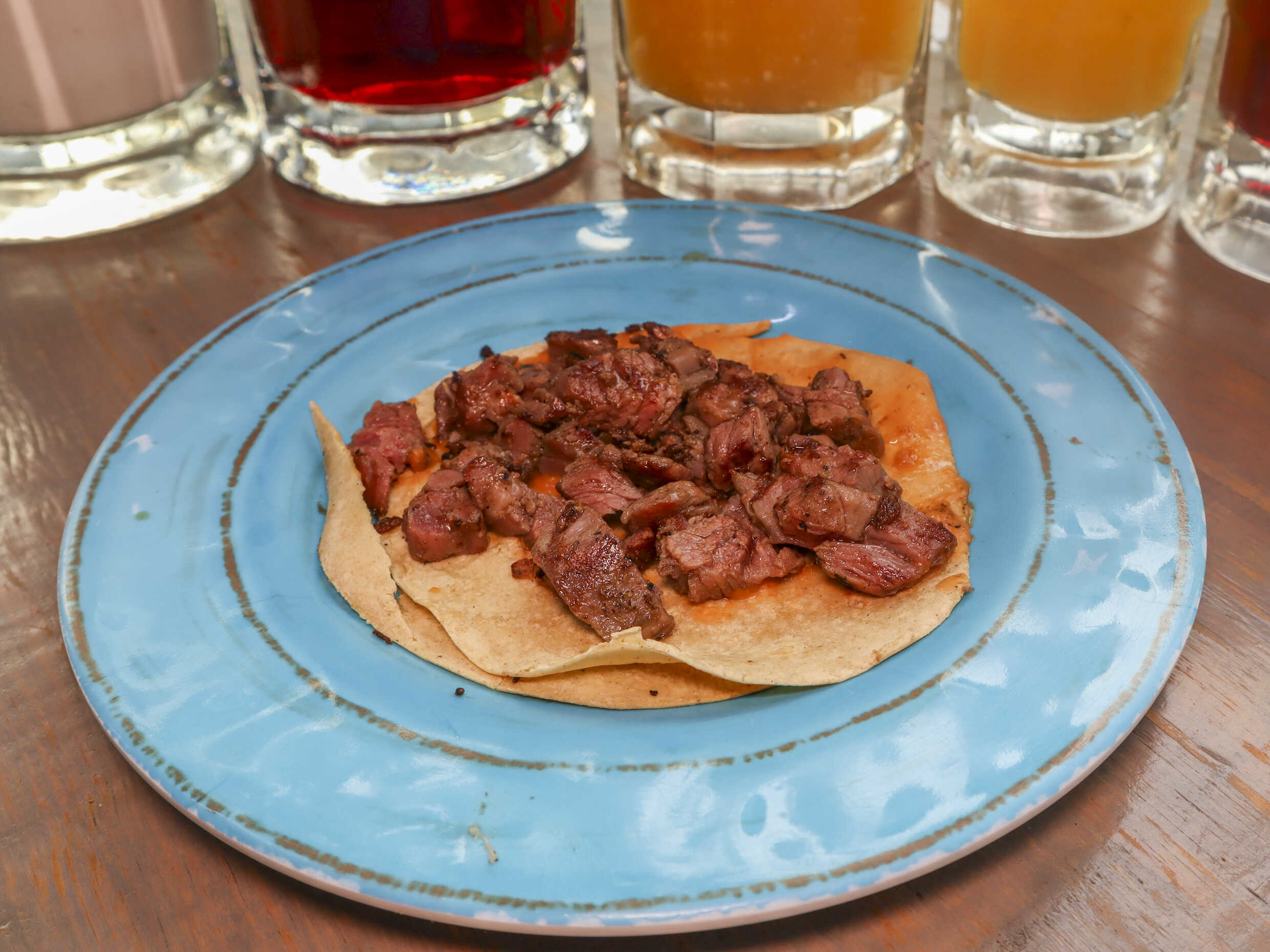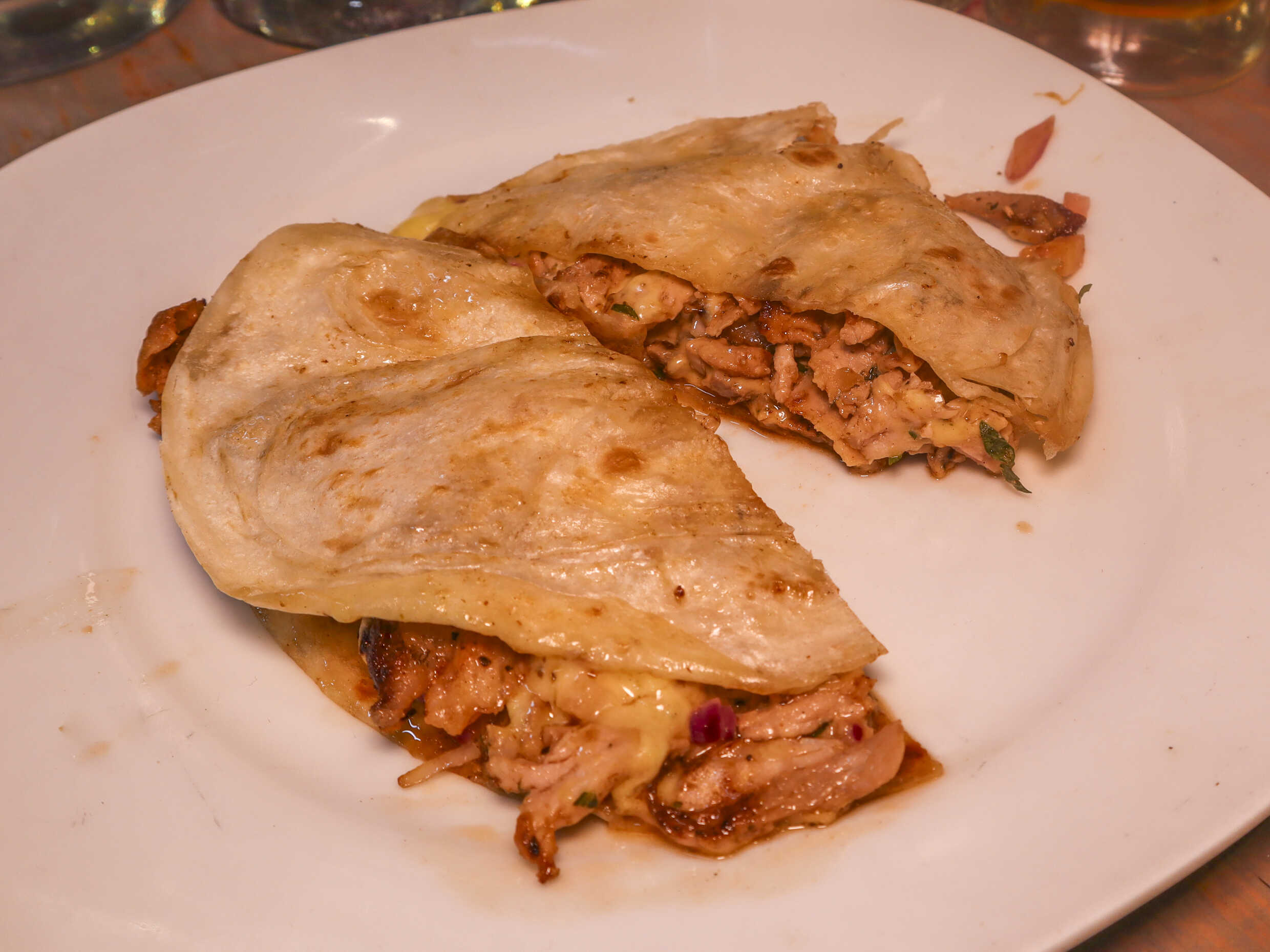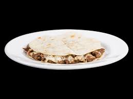 Tortilla de harina con frijoles maneados, manchego, cebolla y carne a elegir.