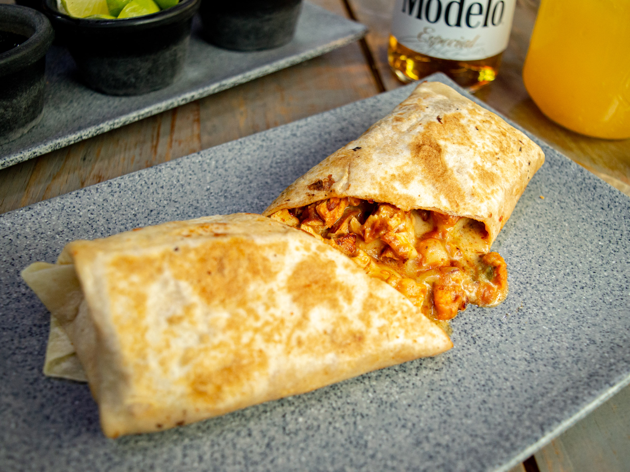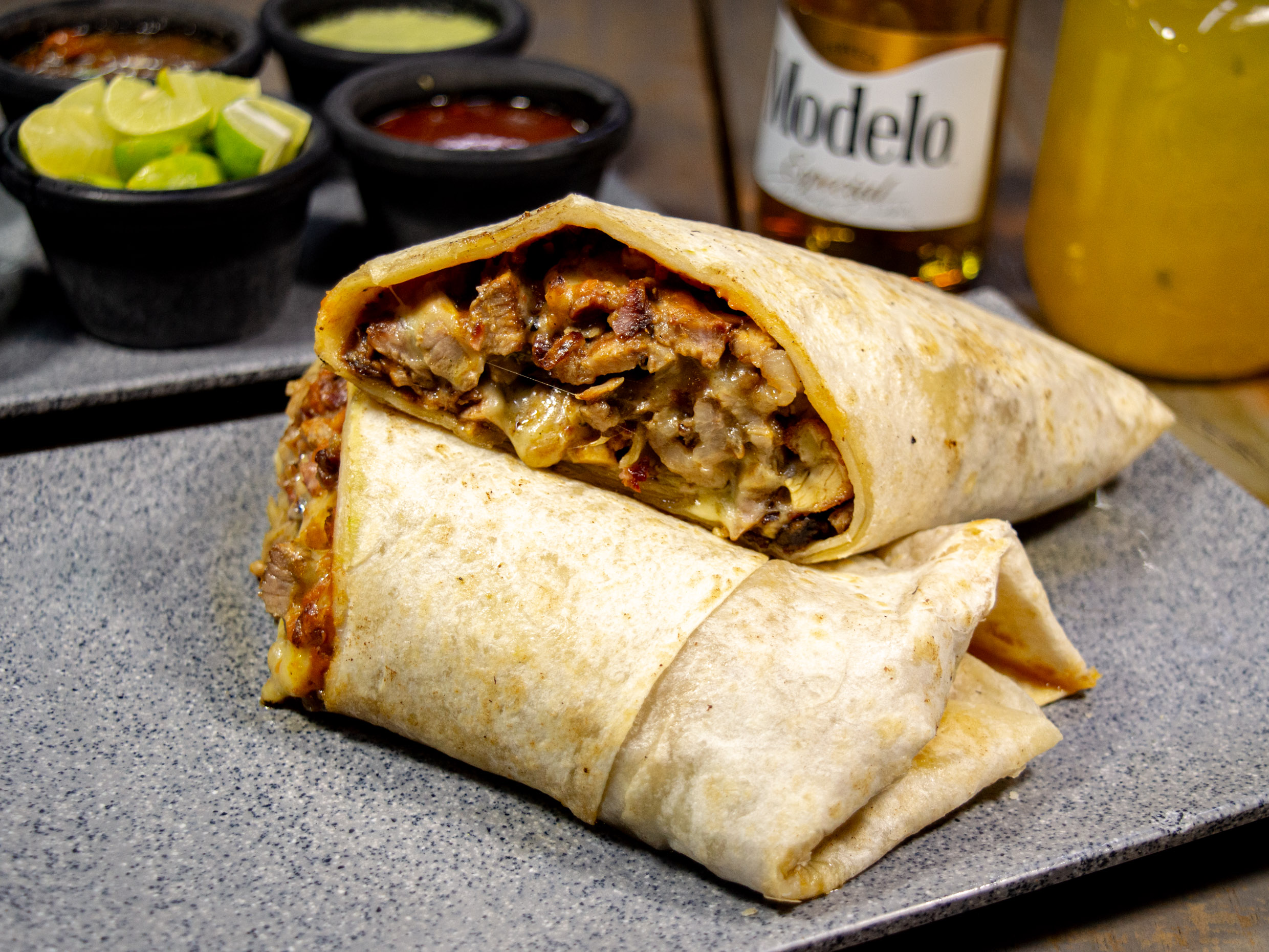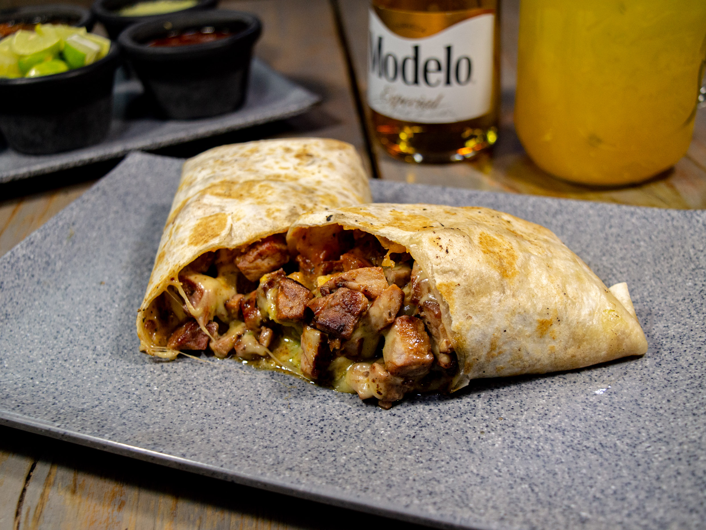 Burrito de 30cm, de pastor, piña y tocino, con frijoles maneados, queso manchego, crema, guacamole.