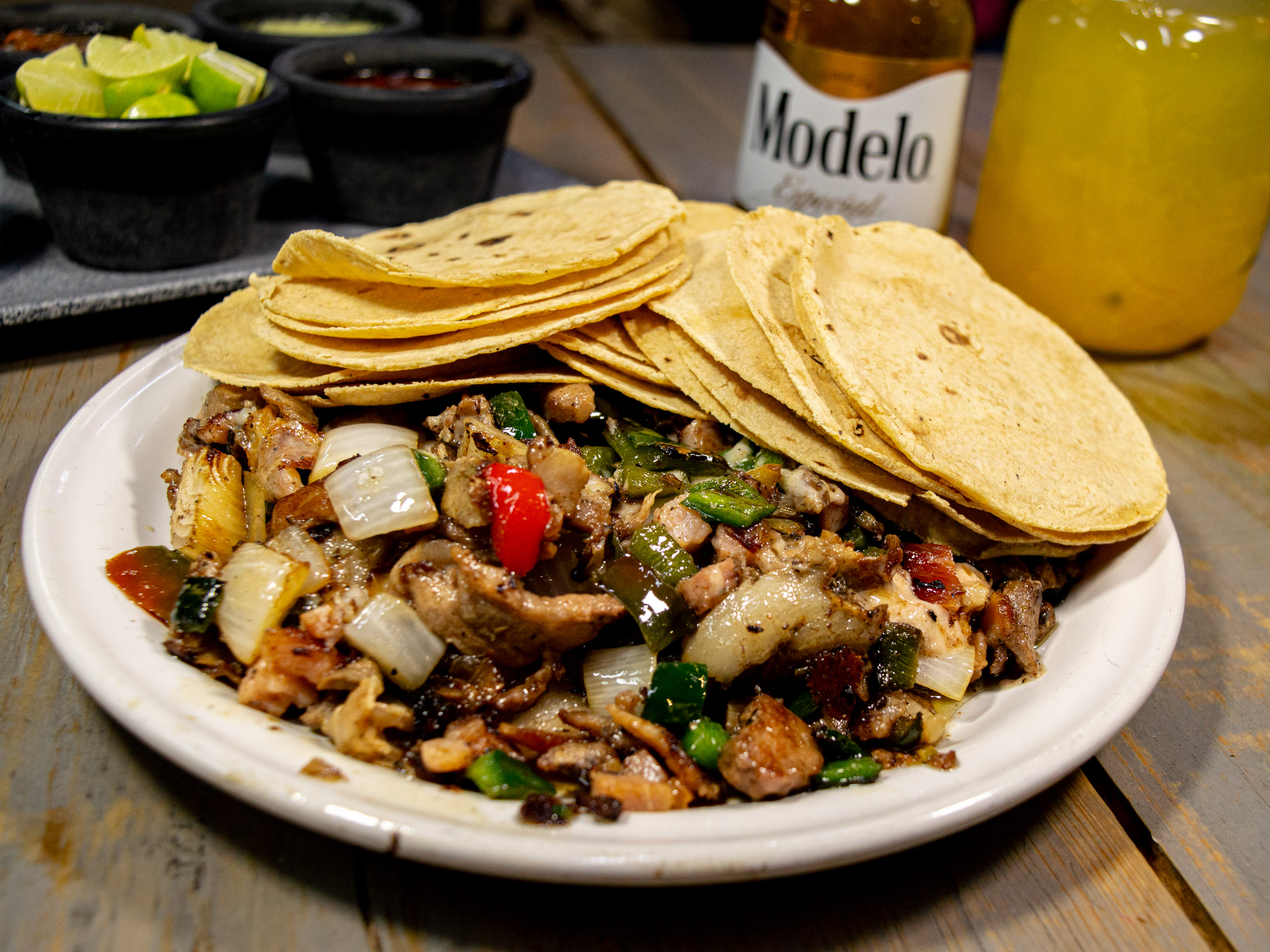 Pastor, bistec, pimiento, cebolla, queso manchego y tortillas