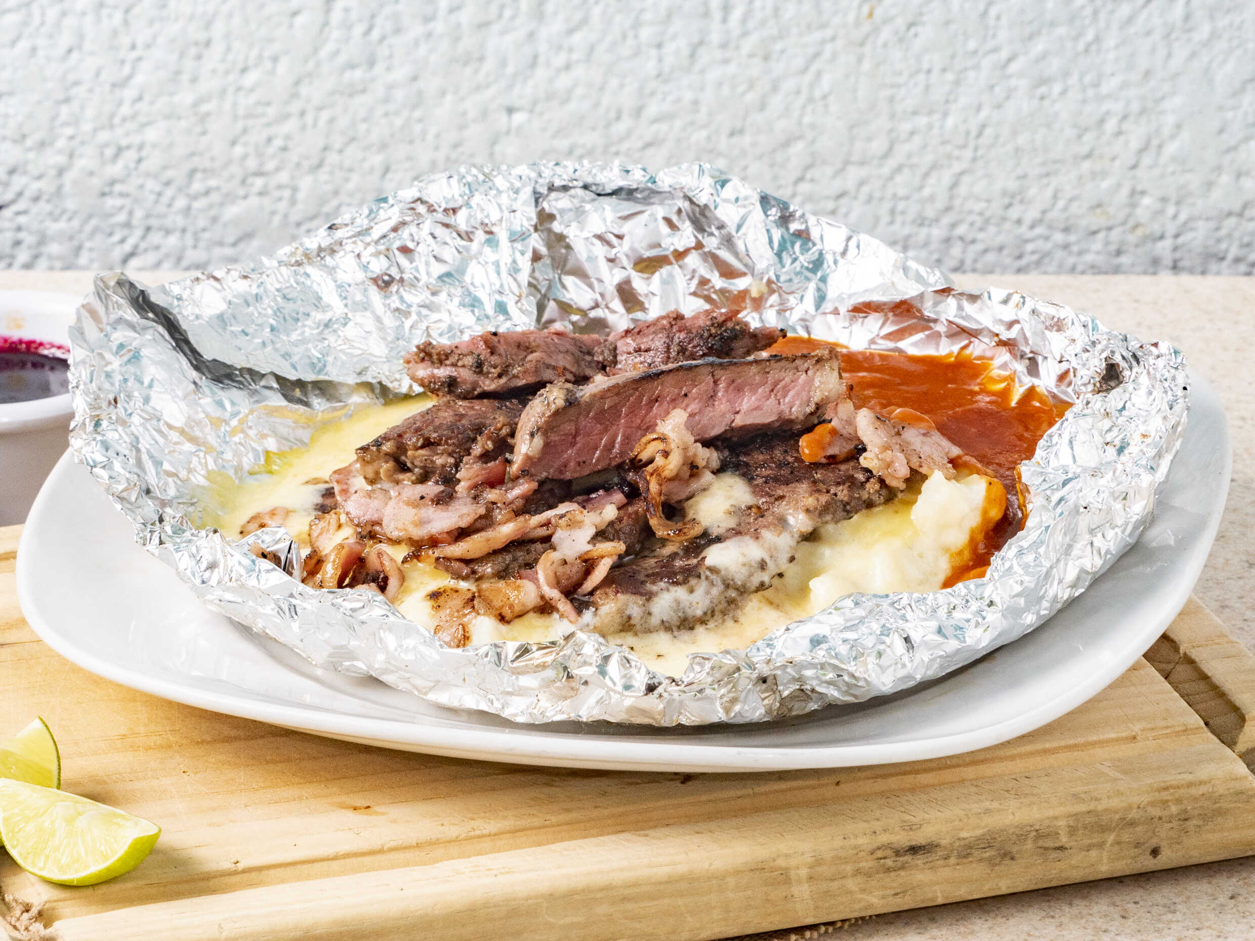 Arrachera, tocino, pastor. Base de frijoles meneados, queso manchego, crema y guacamole.