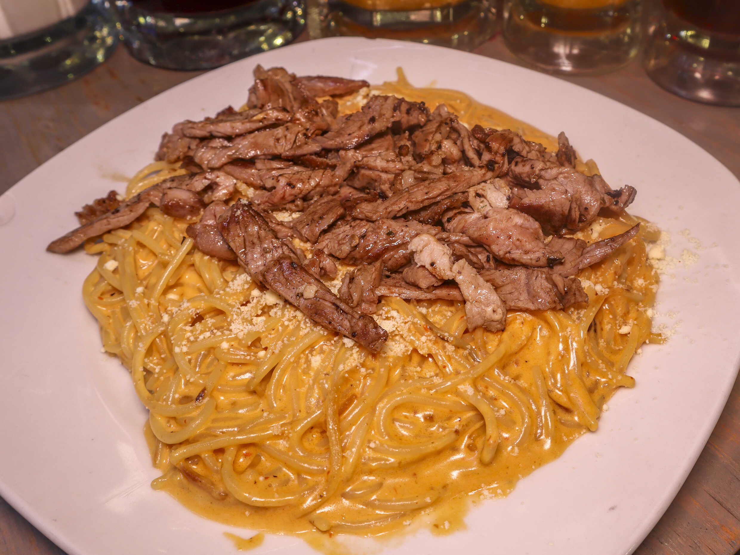 Tortilla de harina, bistec, longaniza, alambre, frijoles maneados, queso manchego, crema y queso