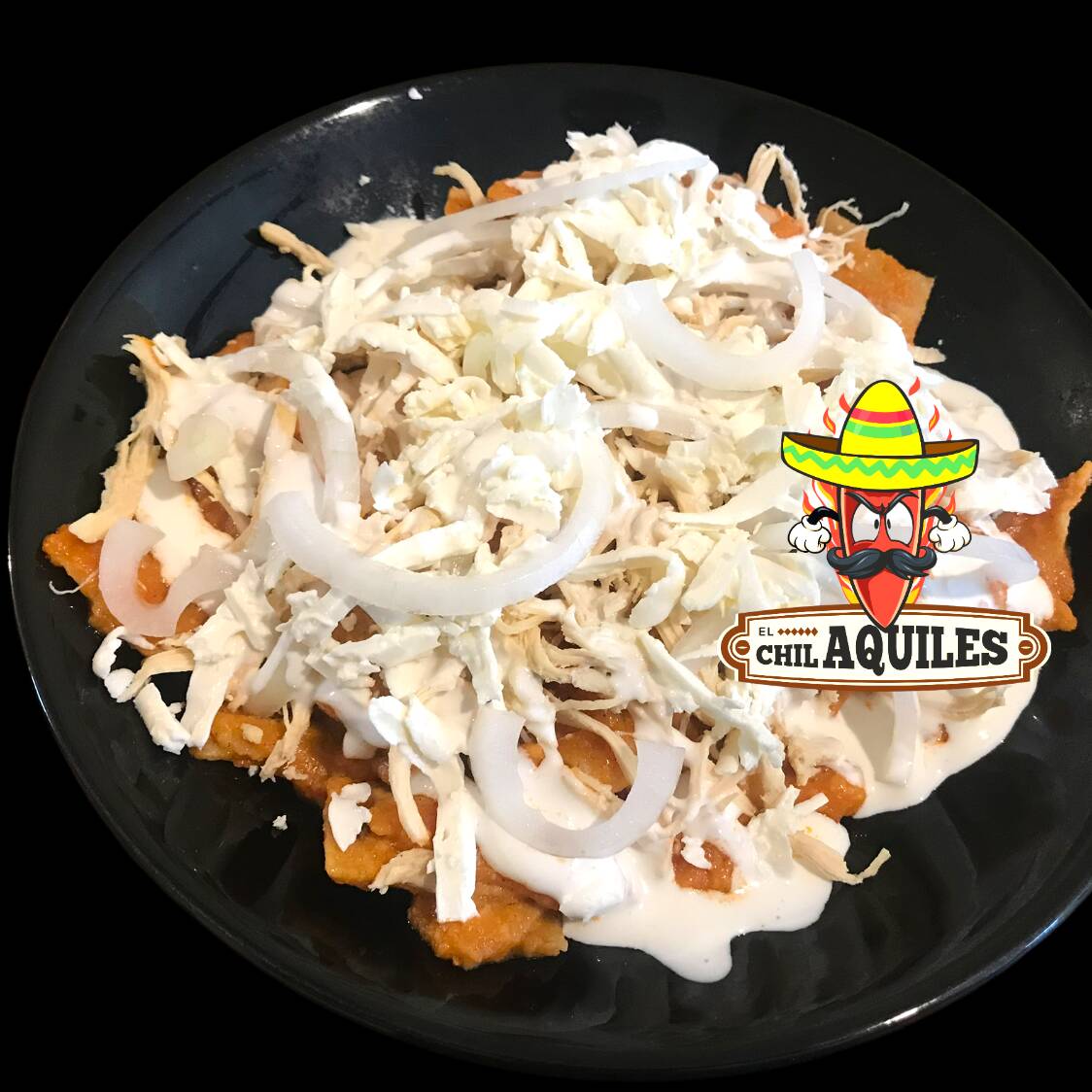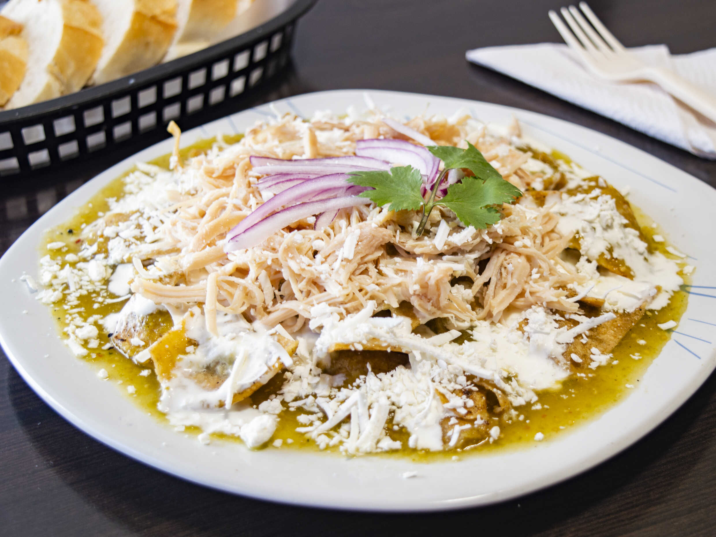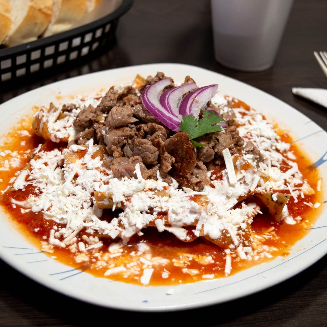 Sabrosos chiquiles en salsa roja, con pollo desmenusado, queso, crema, cebolla y pan.