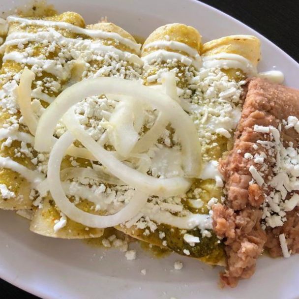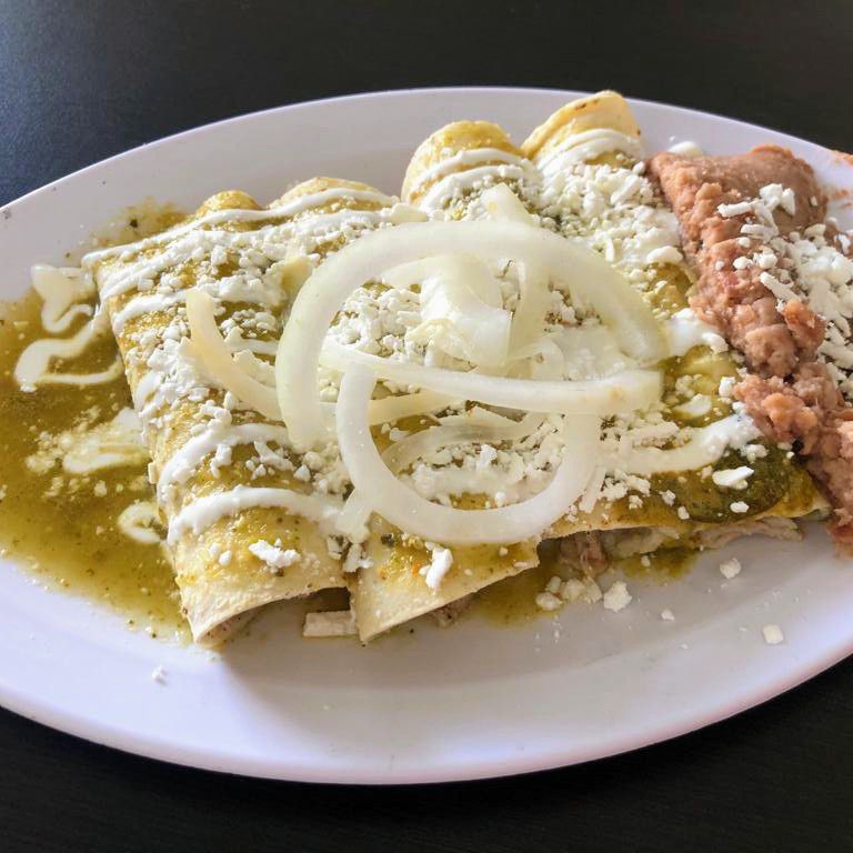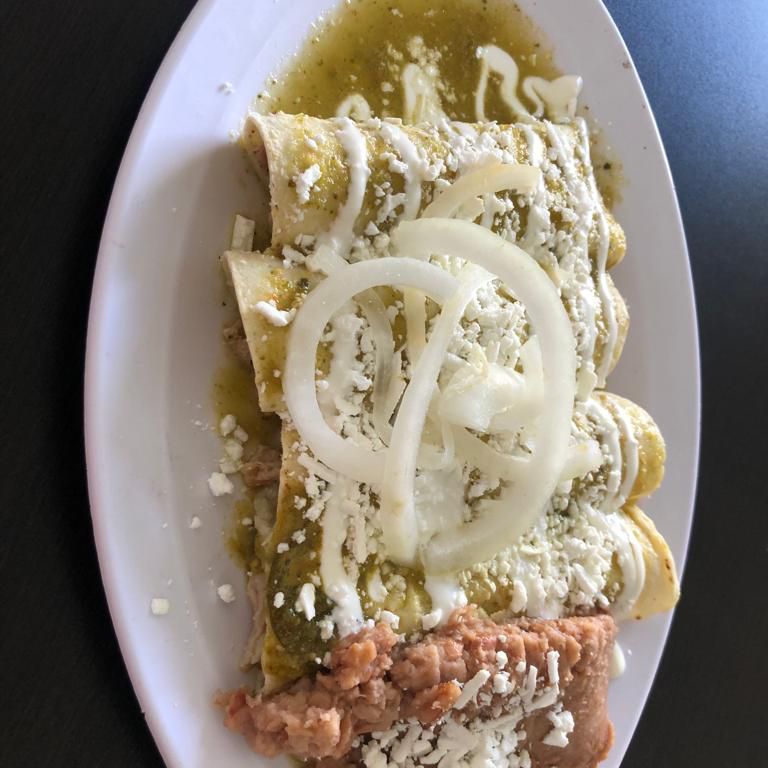 Deliciosas enchiladas en salsa verde, con queso, crema, cebolla, compañadas de frijoles refritos.