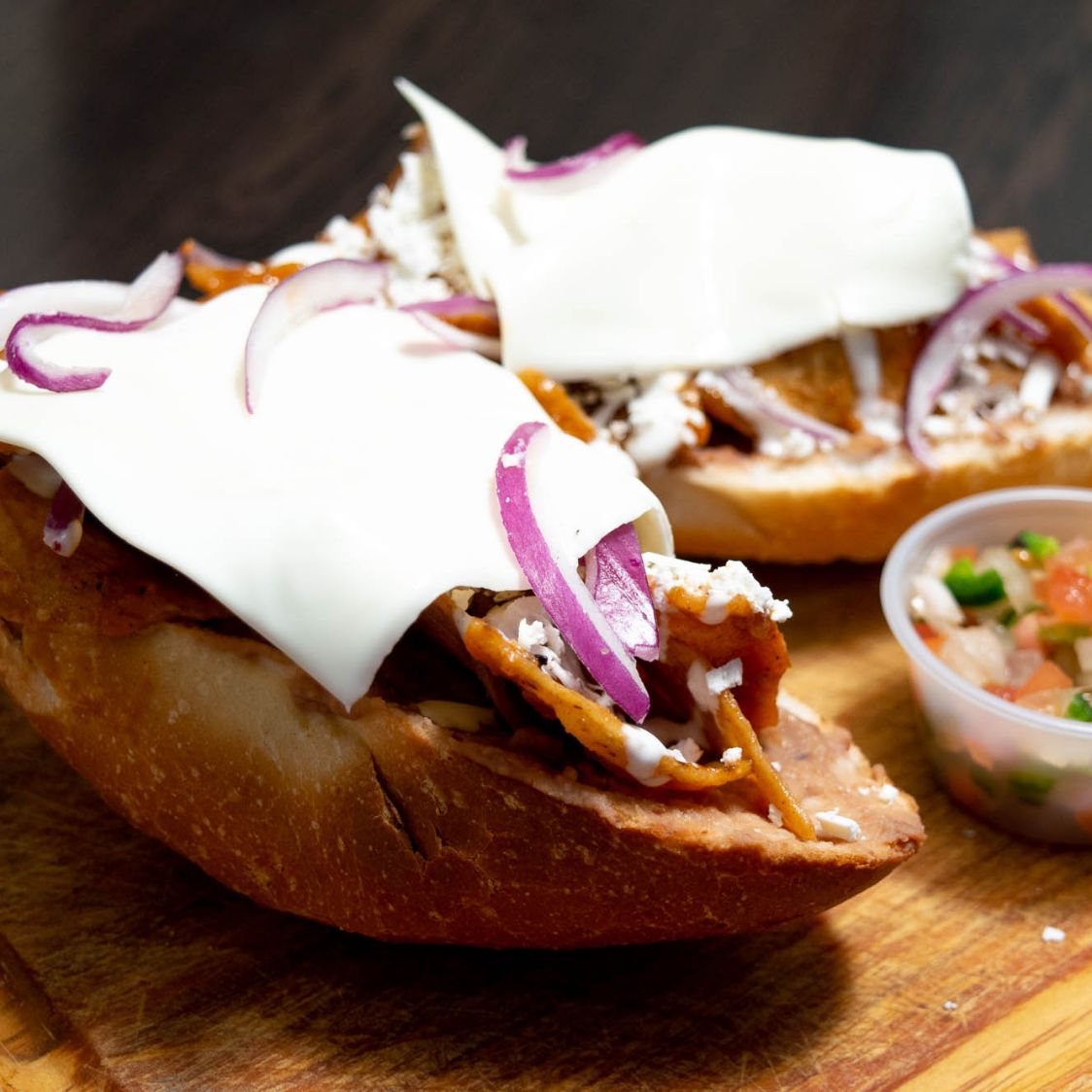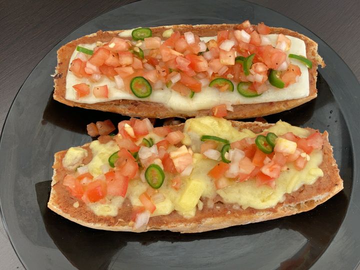 Dos molletes con frijoles refritos, queso gratinado y salsa pico de gallo.