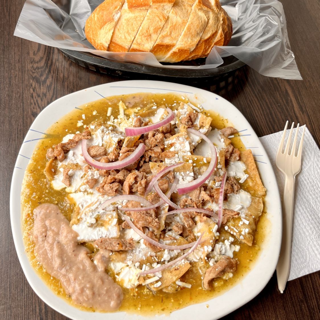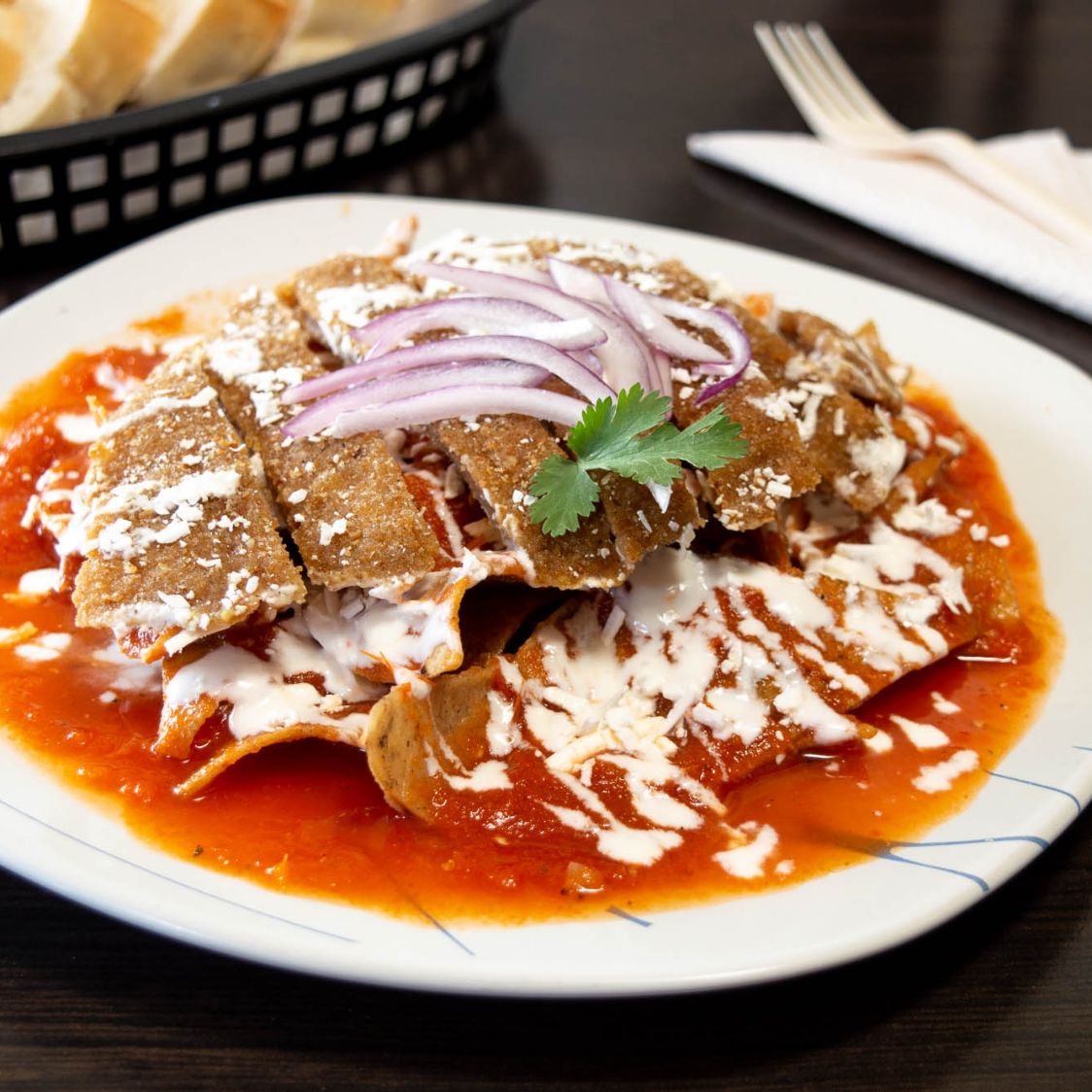 Deliciosos chilaquiles en salsa roja, con milanesa, queso, crema, cebolla y pan.