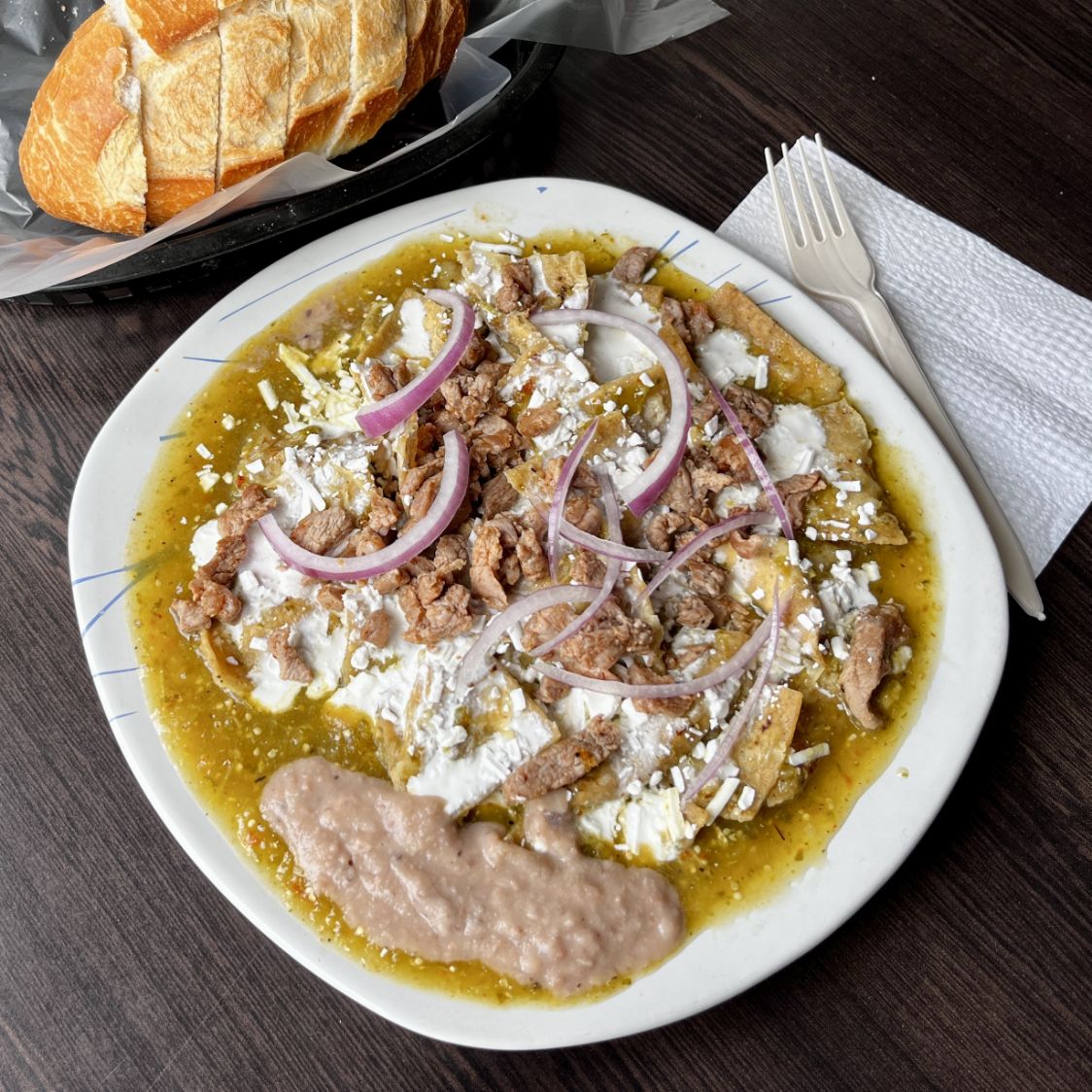 Sabrosos chilaquiles en salsa verde con bistec picado, preparalos al momento con crema, queso, cebolla, frijoles y pan.