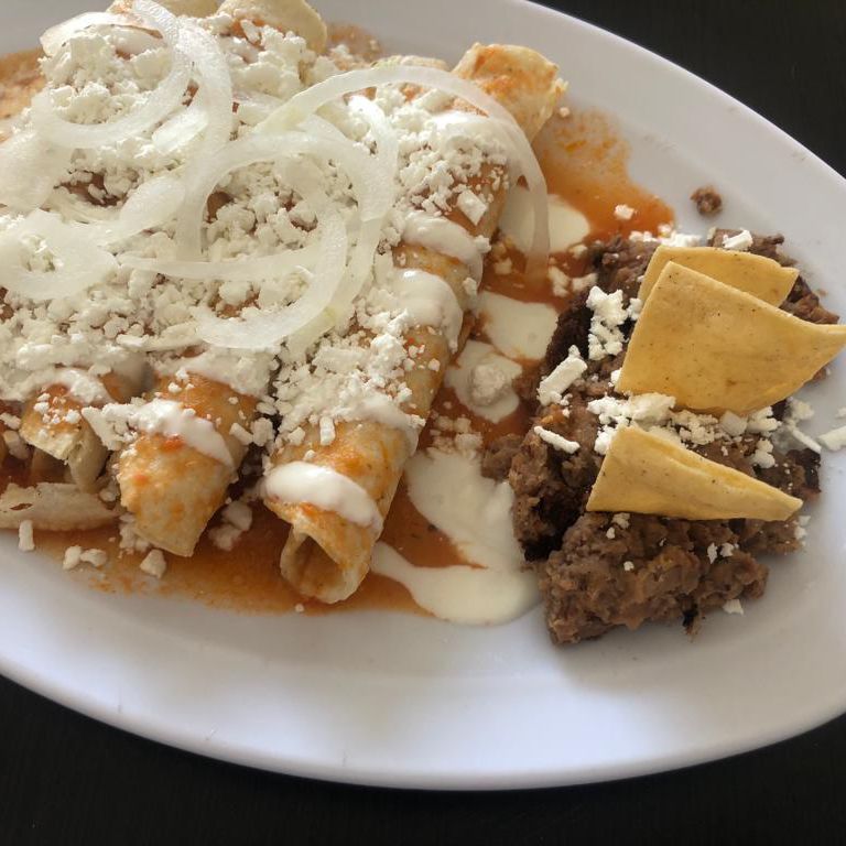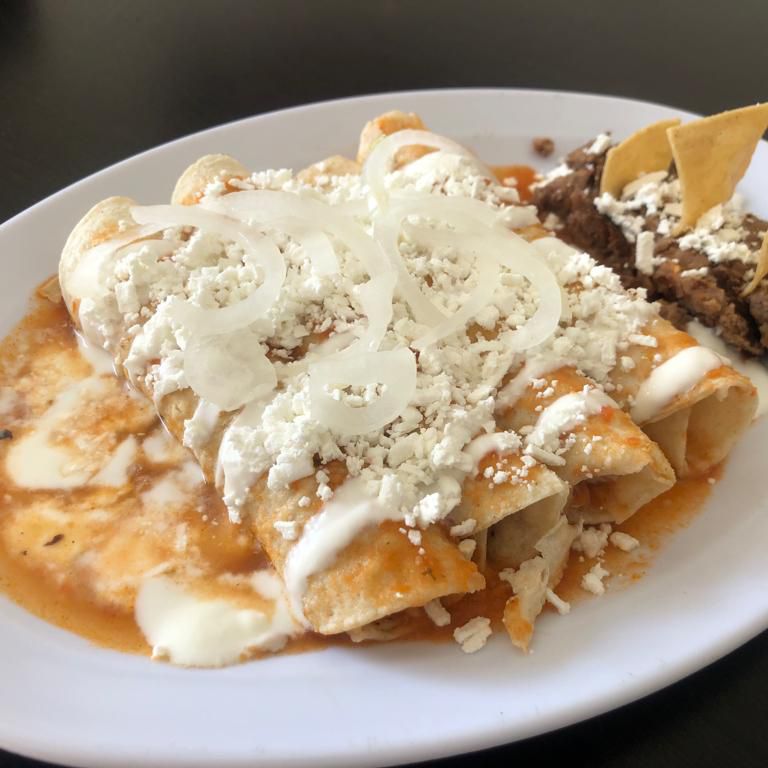 Deliciosas enchiladas en salsa roja con pollo, queso, crema, cebolla y frijoles refritos.