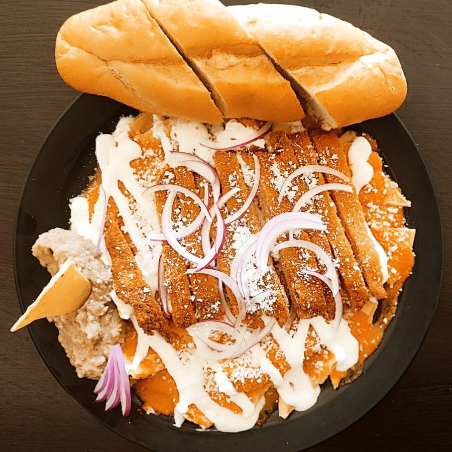 Deliciosa torta de chilaquiles con frijoles, milanesa, queso, crema, cebolla. Elige la salsa de tu preferencia.