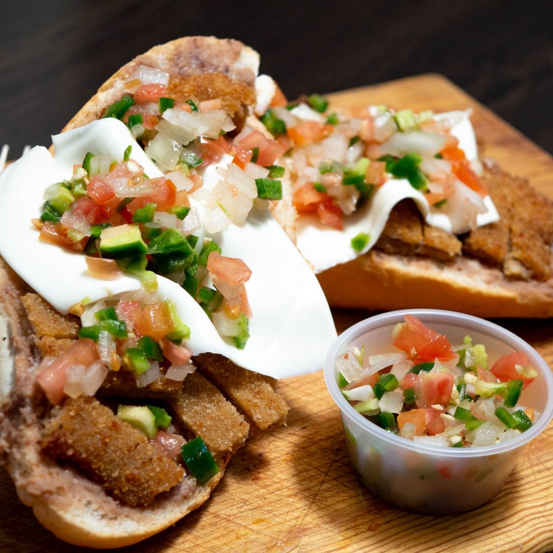 Dos molletes, con frijoles fefritos, queso fundido y deliciosa milanesa. Con salsa pico de gallo.