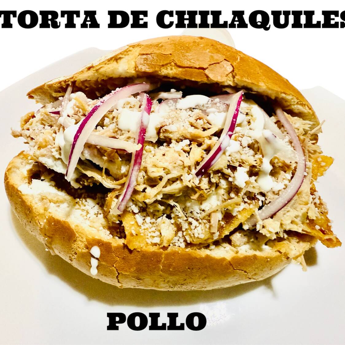 Deliciosa torta de Chilaquilesncon Pollo, frijoles, crema, queso y cebolla morada. Pidelas con la salsa de tu preferencia.