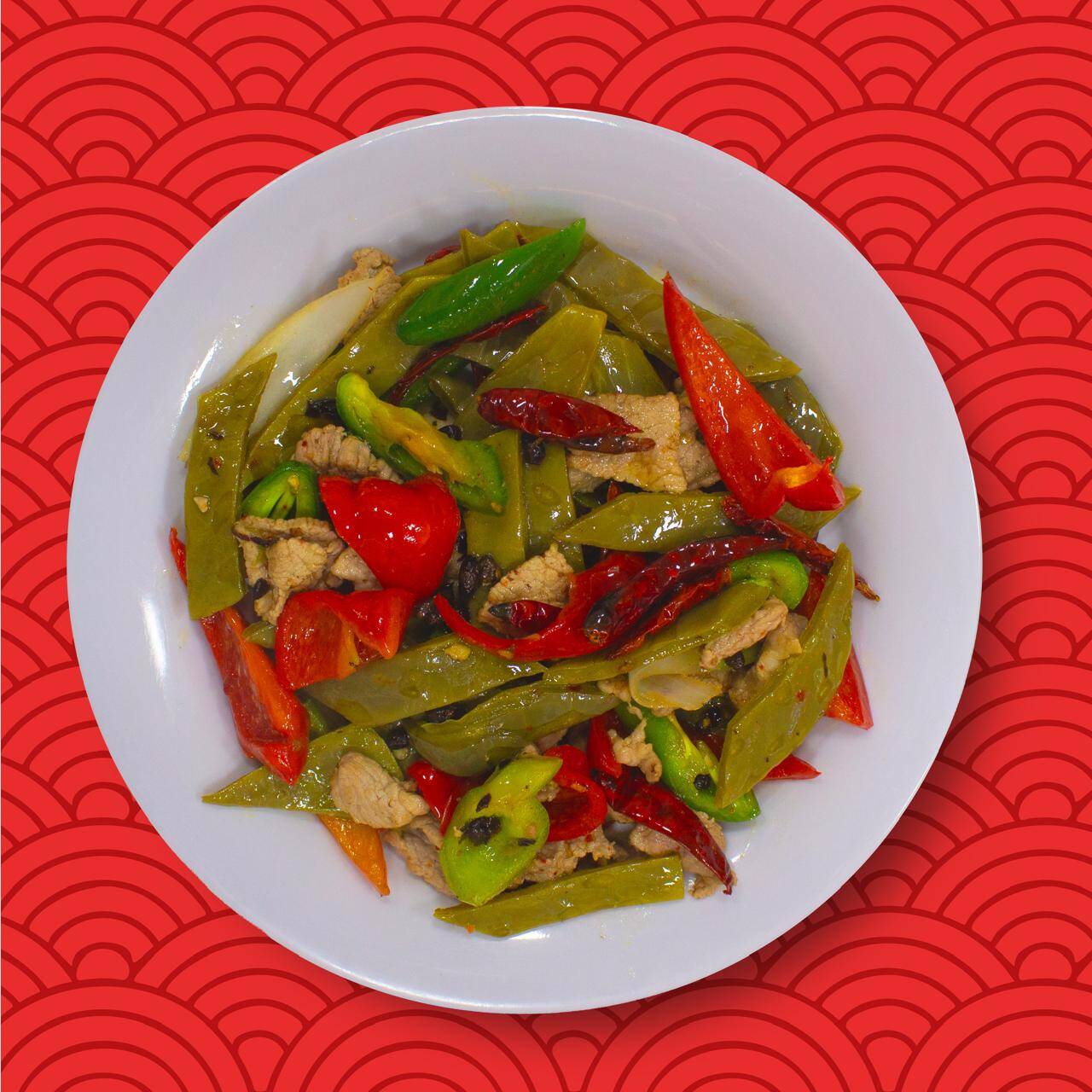 Nopales con cerdo y un toque de picante complementado con delicioso frijol chino