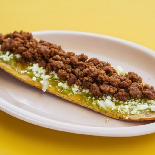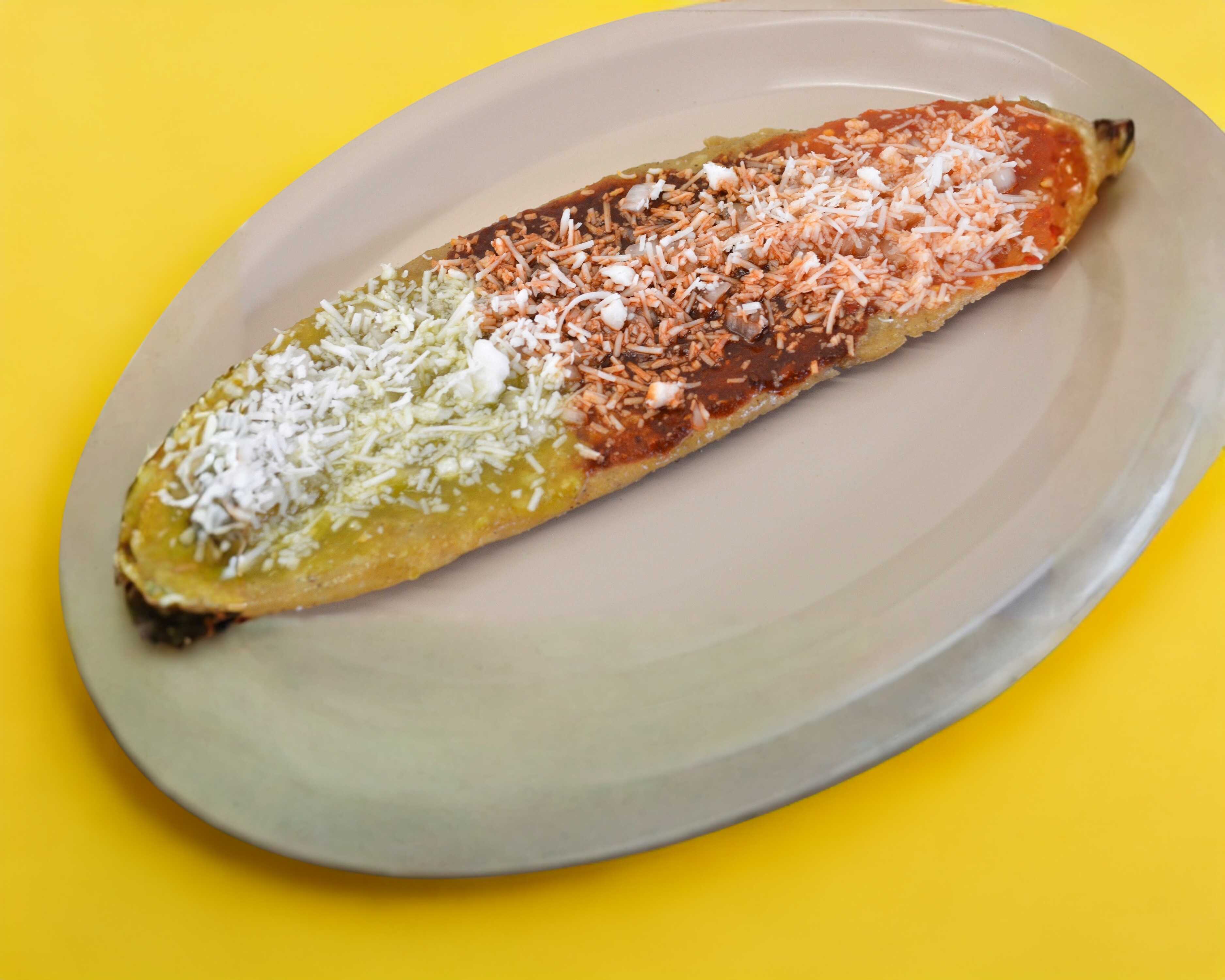 Huarache elaborado artesanalmente con frijol dentro de la tortilla, salsa verde, roja o pasilla; cebolla, queso rallado.