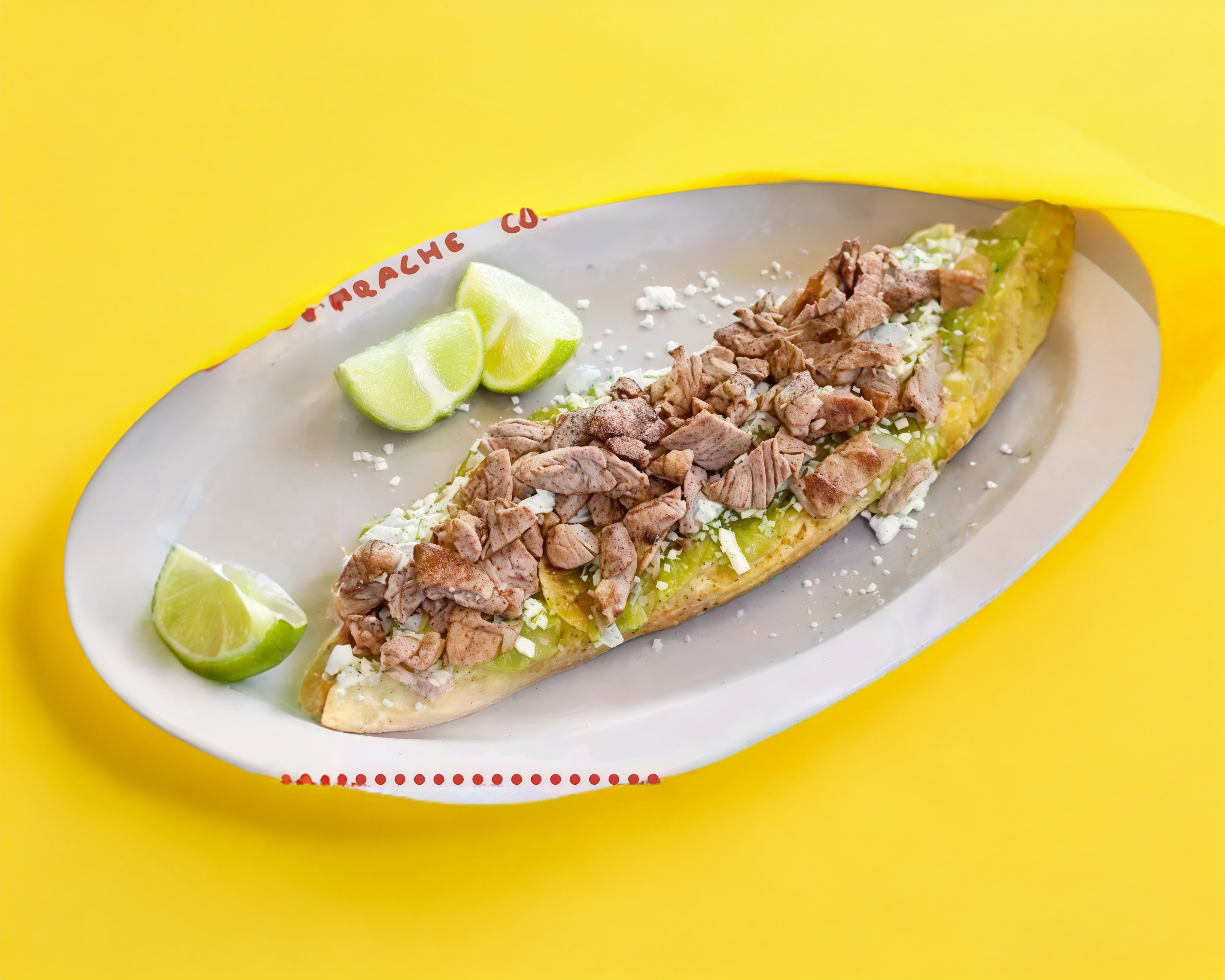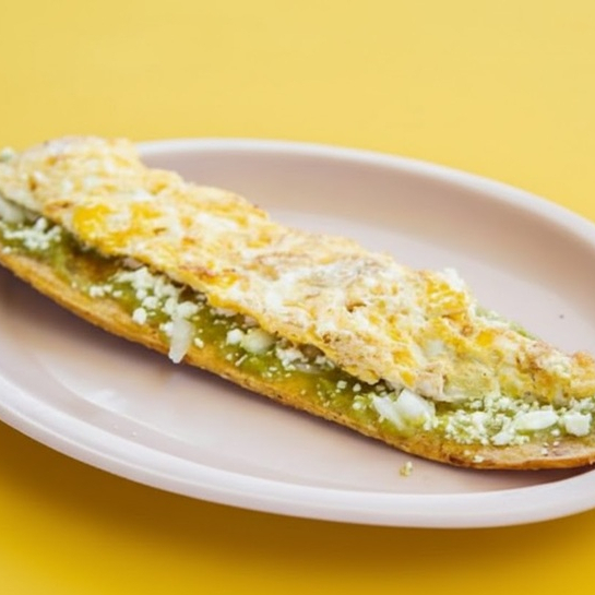Elaborado con tortilla de harina grande, pimiento, cebolla, queso Oaxaca, frijol.