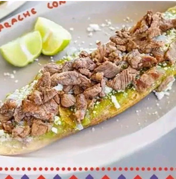 Huarache de Bistec (80 gramos aprox)elaborado artesanalmente con frijol dentro de la tortilla de harina de maiz, salsa verde, roja o pasilla; cebolla, queso rallado.