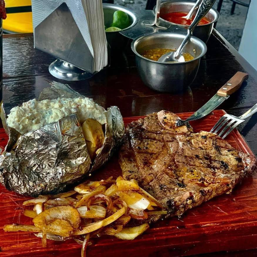 Rib.eye, sirloin, chorizo argentino, morron, ceolla y queso.