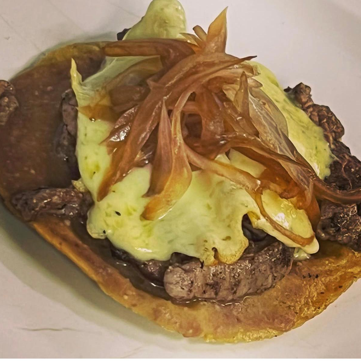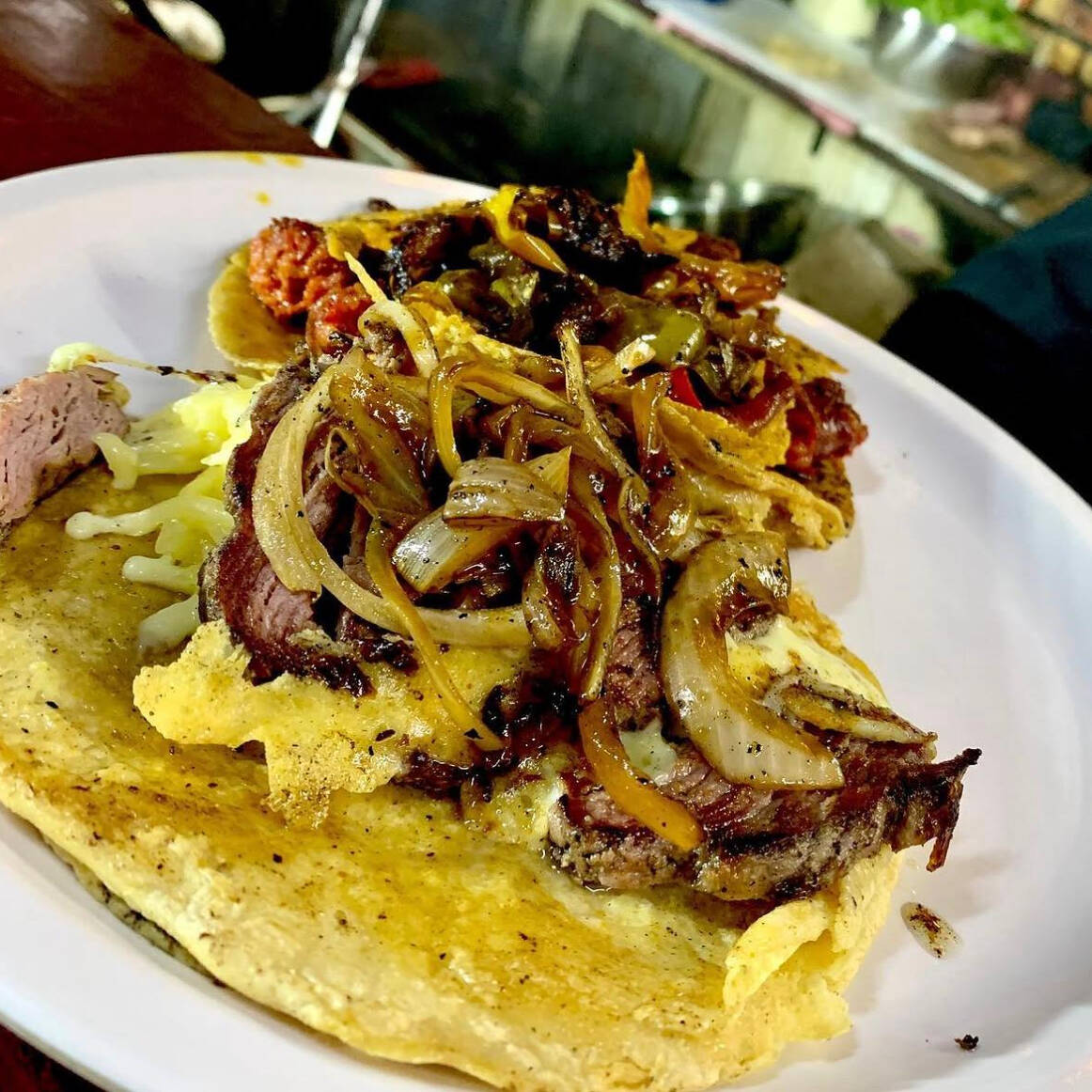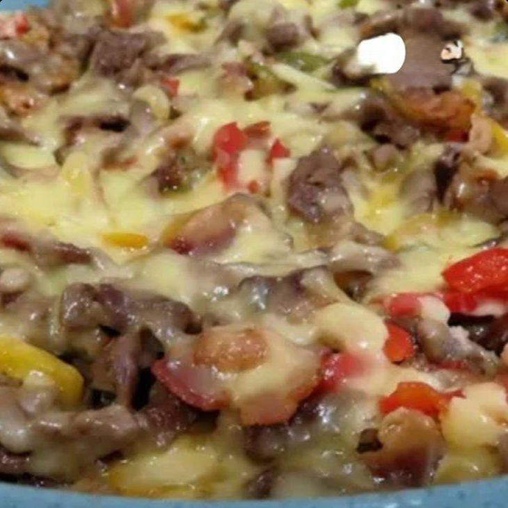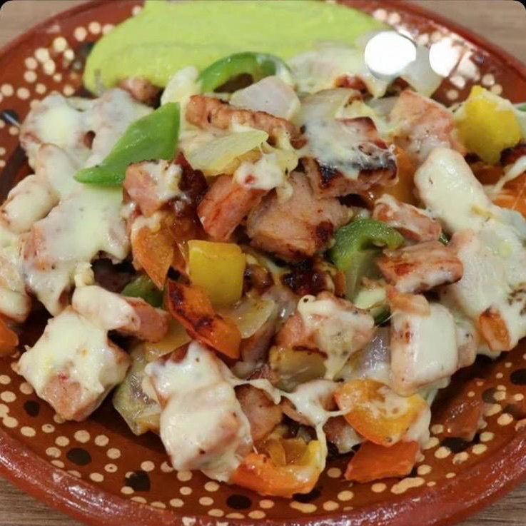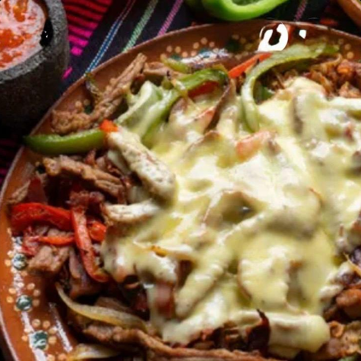 Arrachera, champiñón, morron, cebolla y queso.