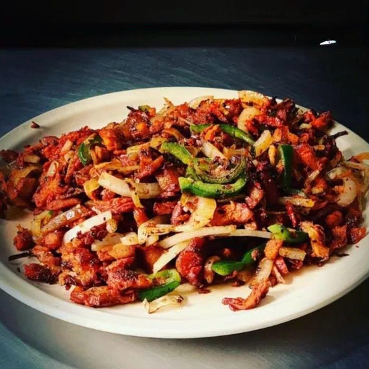 Carne al pastor, morron, cebolla y queso.