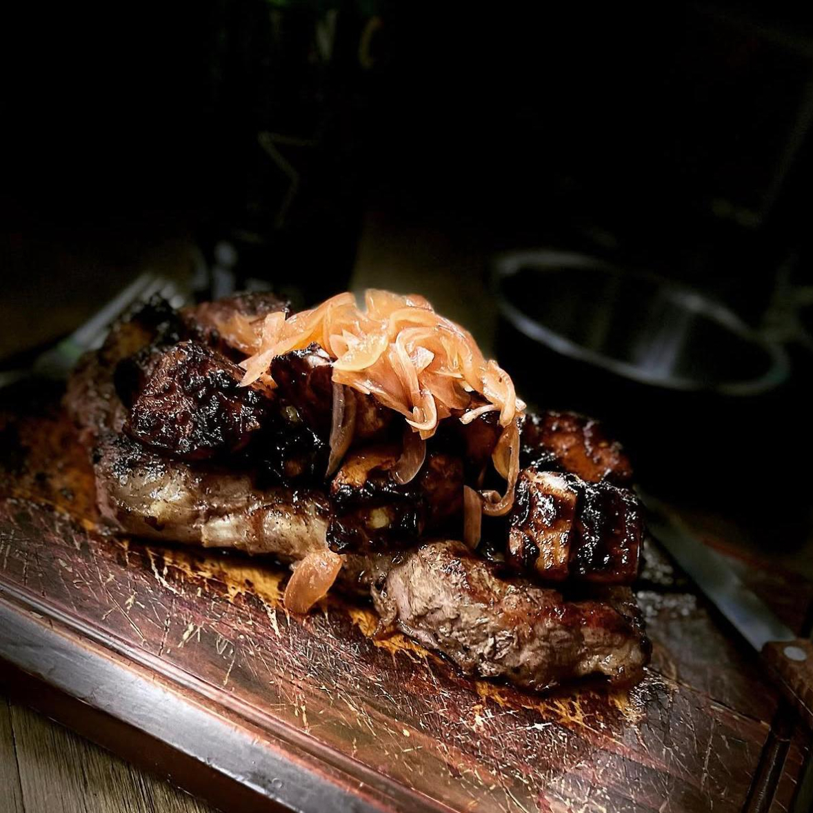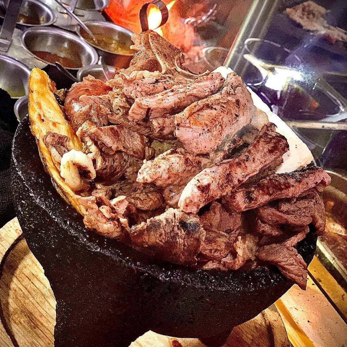 Arrachera, rib-eye, sirloin. Tocino, chistorra, morron, cebolla y queso.