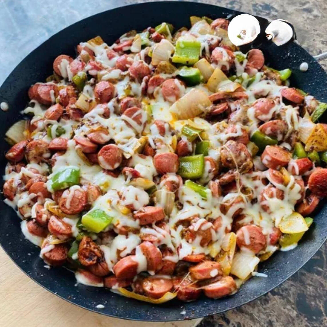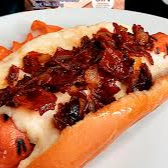Salchicha frankfurt, tocino, queso manchego, jitomate y cebolla.