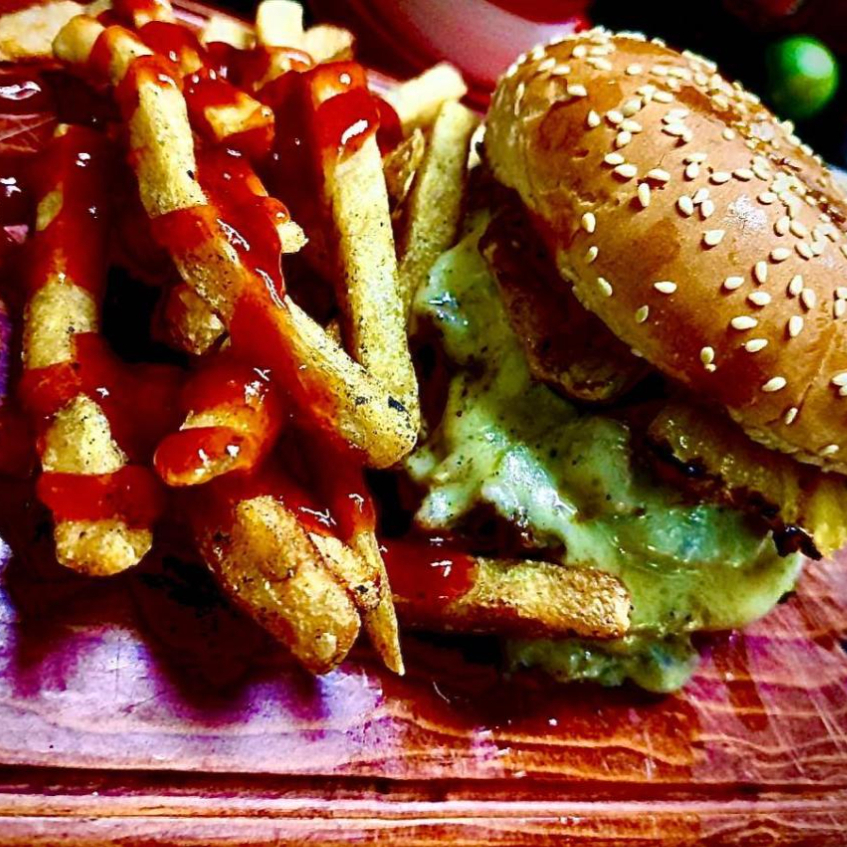 100 g de molida de pollo, lechuga, jitomate, pepinillos y queso manchego (incluye papas a la francesa).