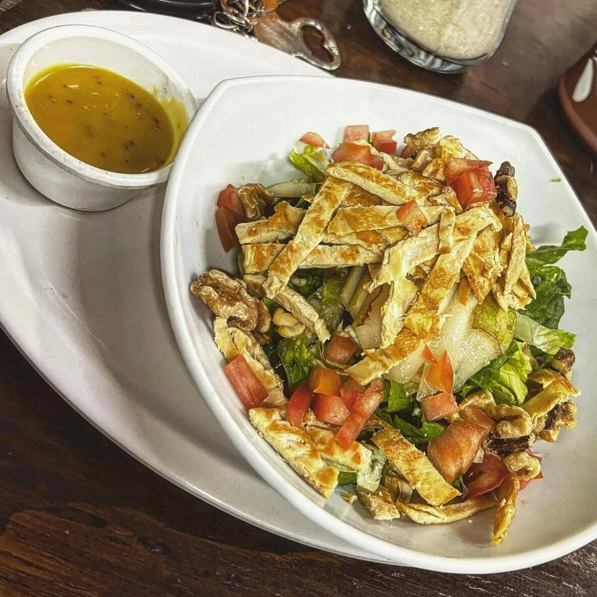 Mezcla de lechugas con aderezo de mostaza y miel, tiras de pechuga asada 80 g, trozos de nuez y rebanadas de pera.