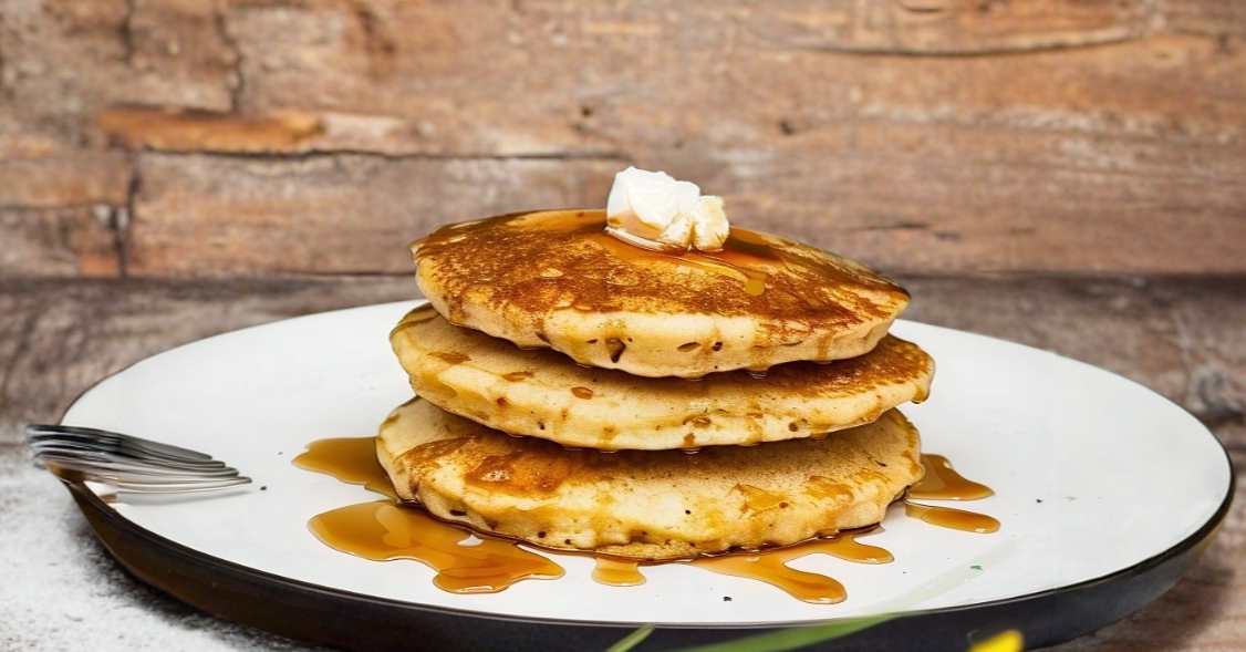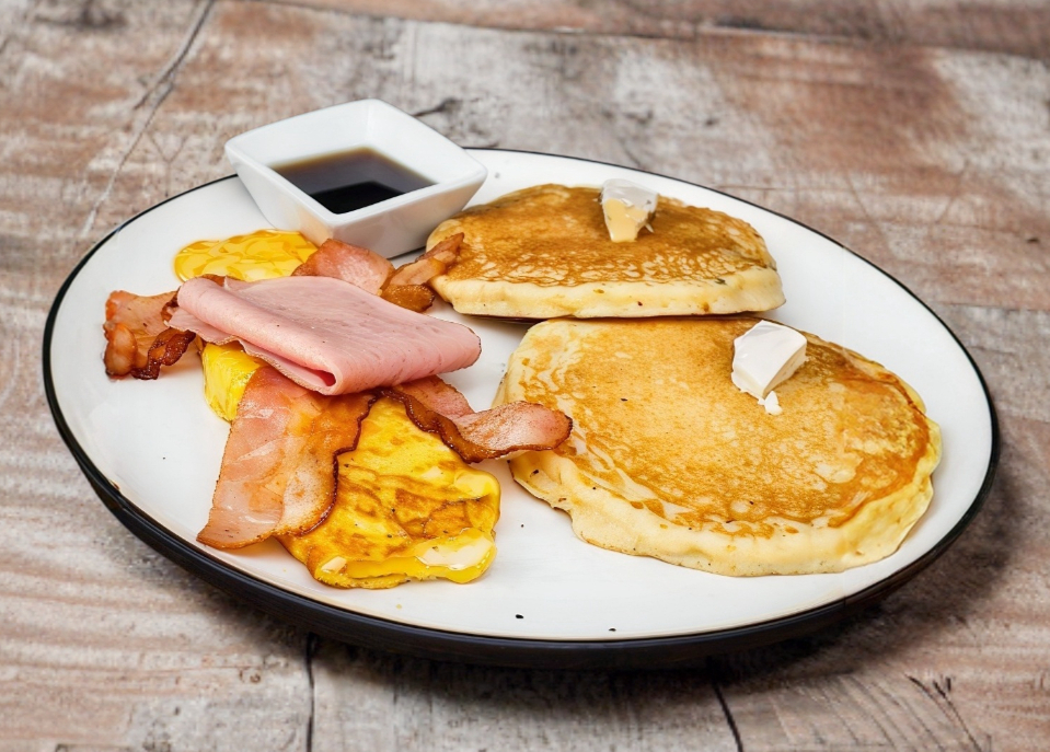 2 Hotcakes con Huevos Revueltos, Jamón y Tocino