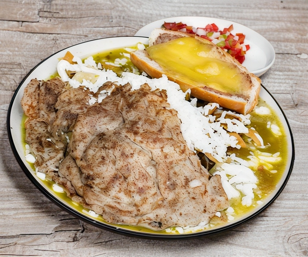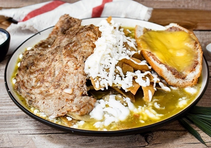 Chilaquiles verdes o rojos con Bistec Asado y Un Mollete Gratinado.