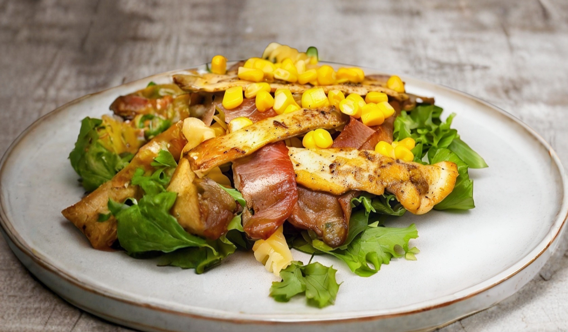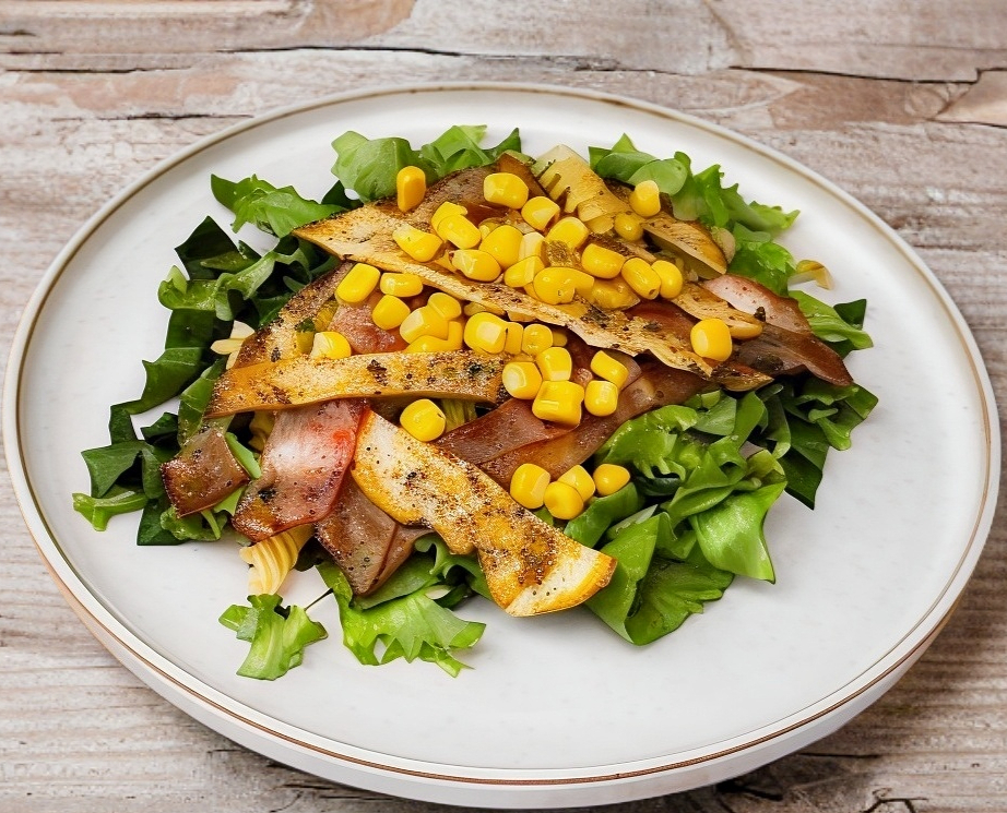 Lechuga, espinaca, pasta, grano de elote, pechuga asada y tocino.