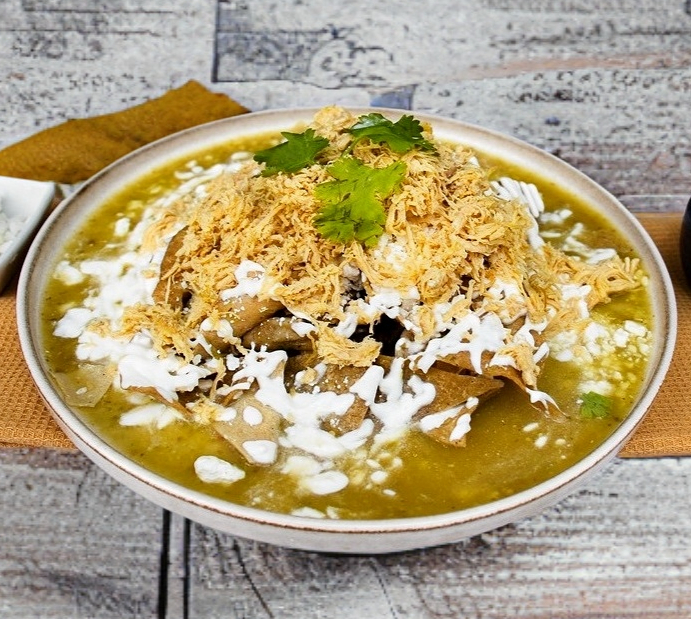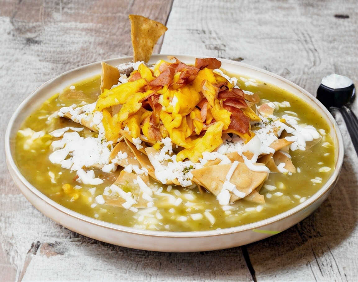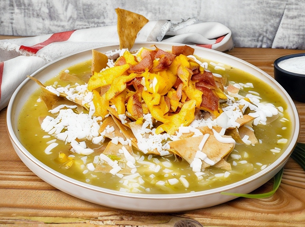 Totopos remojados en salsa verde o roja, con cebolla crema y queso.
