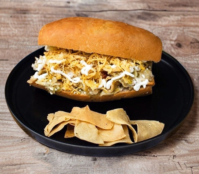 Pechuga asada, queso manchego, lechuga, jitomate, frijoles y mayonesa.