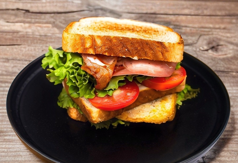 2 panes, huevo estrellado en medio, jamón, tocino, queso amarillo, lechuga, jitomate, frijoles y mayonesa.