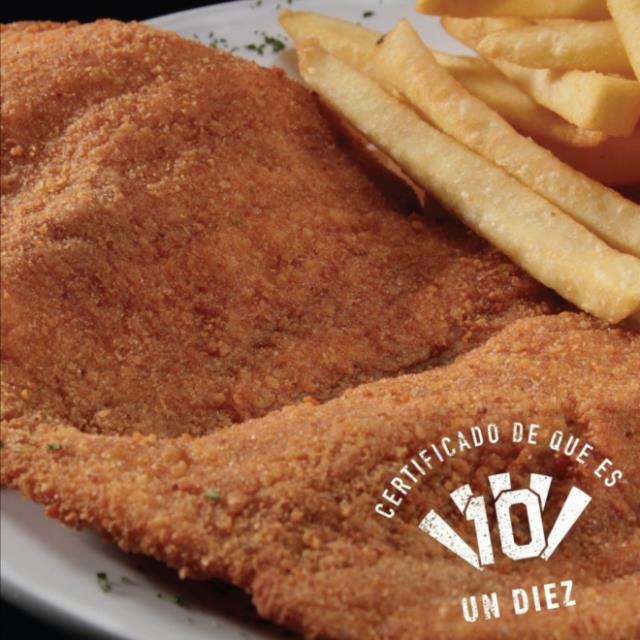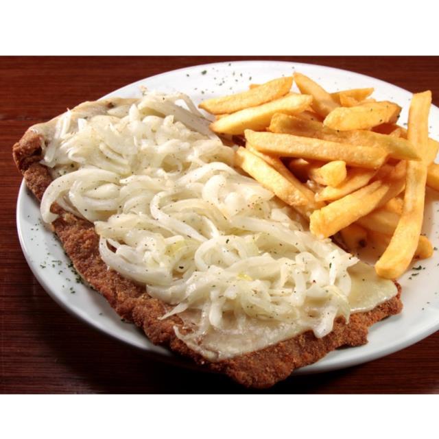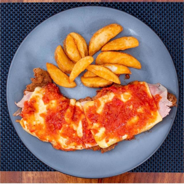 Milanesa de New York gratinada con queso Gouda, jamón y salsa tucco, acompañada de papas a la francesa, puré de papas o ensalada.