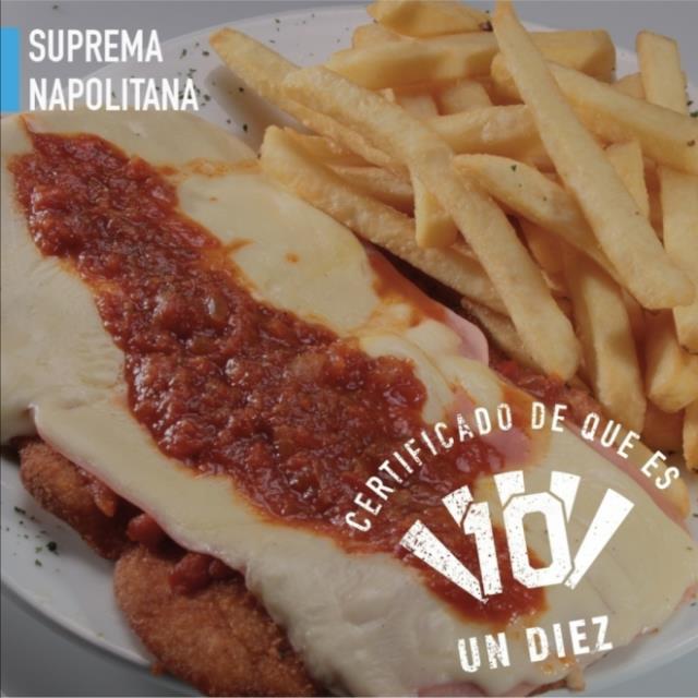 Suprema de pollo Napolitana, la puedes acompañar con papas a la francesa, ensalada mixta o pure de papas