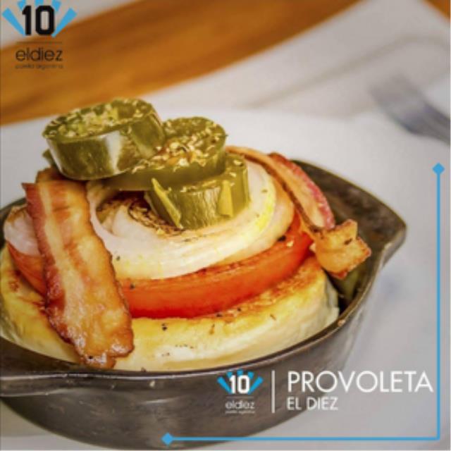 Queso Provoleta El Diez a la parrilla con jitomate, cebolla preparada, tocino y rajas
