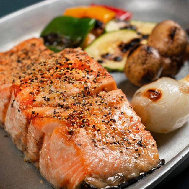 Salmón rosado a las brasas con guarnición de verduras a la parrilla.